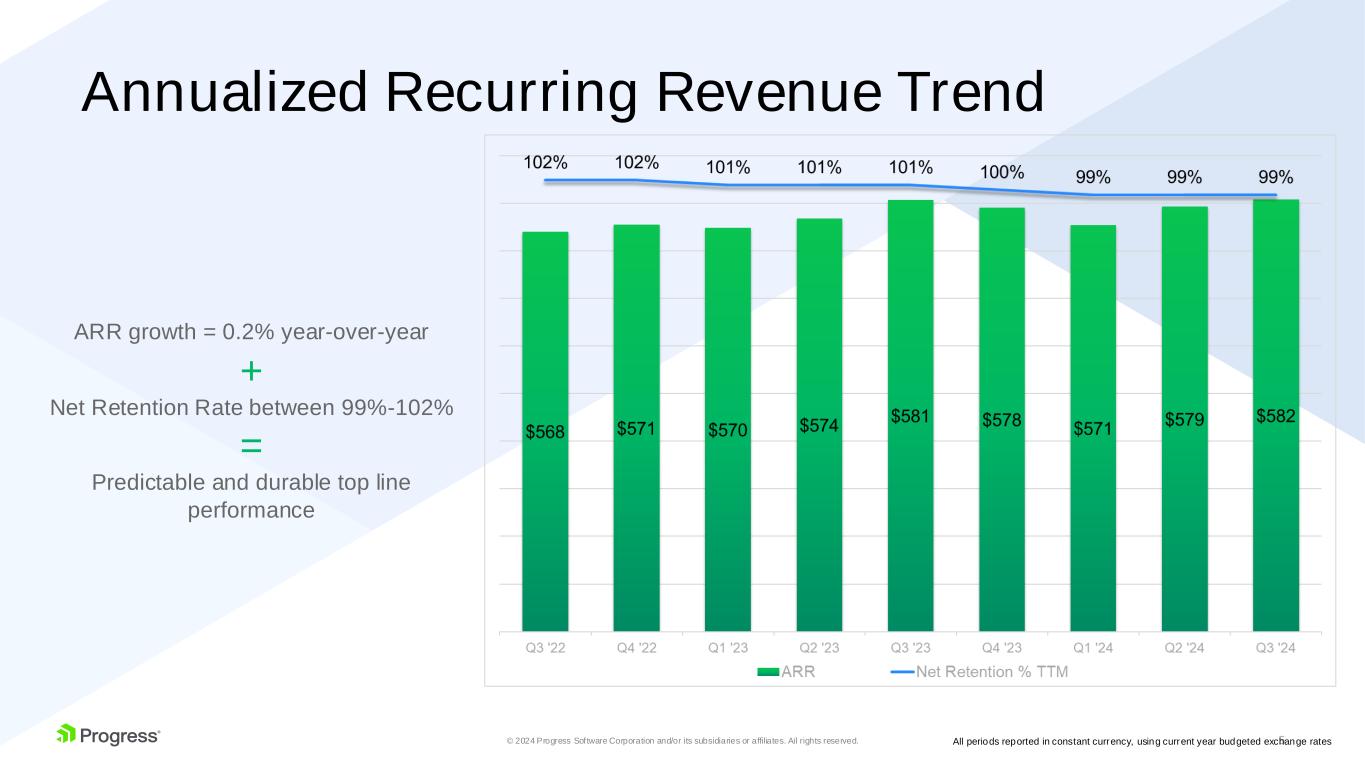 5© 2024 Progress Software Corporation and/or its subsidiaries or affiliates. All rights reserved. Annualized Recurring Revenue Trend All periods reported in constant currency, using current year budgeted exchange rates ARR growth = 0.2% year-over-year + Net Retention Rate between 99%-102% = Predictable and durable top line performance
