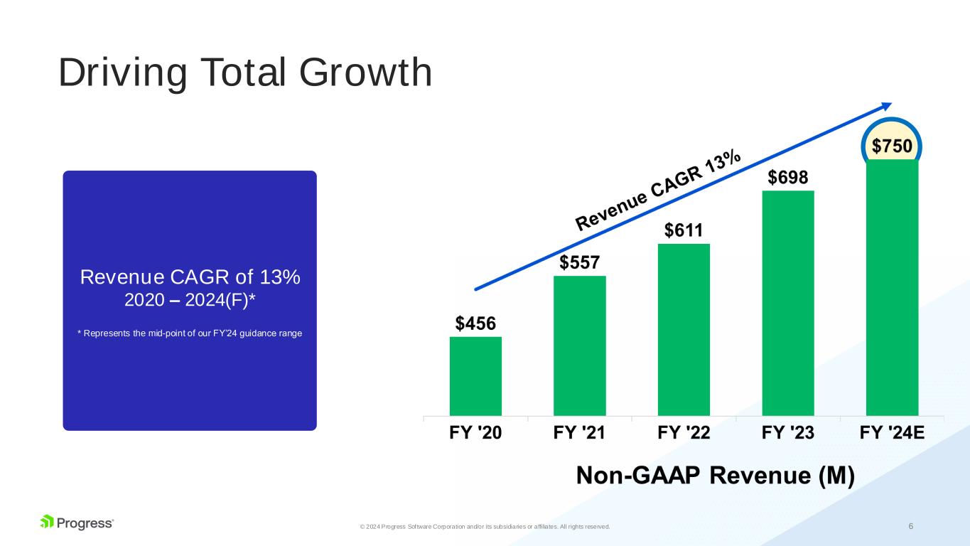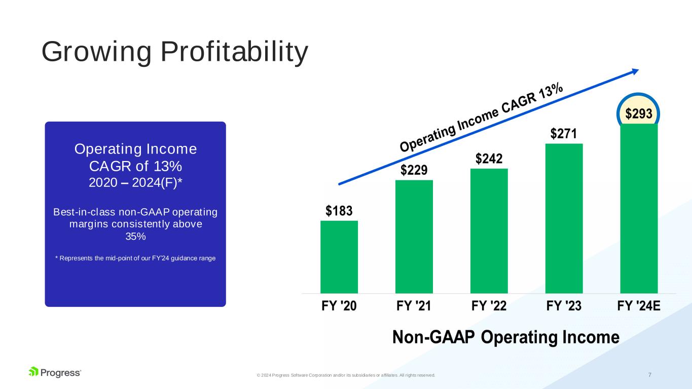 6© 2024 Progress Software Corporation and/or its subsidiaries or affiliates. All rights reserved. Driving Total Growth Revenue CAGR of 13% 2020 – 2024(F)* * Represents the mid-point of our FY’24 guidance range