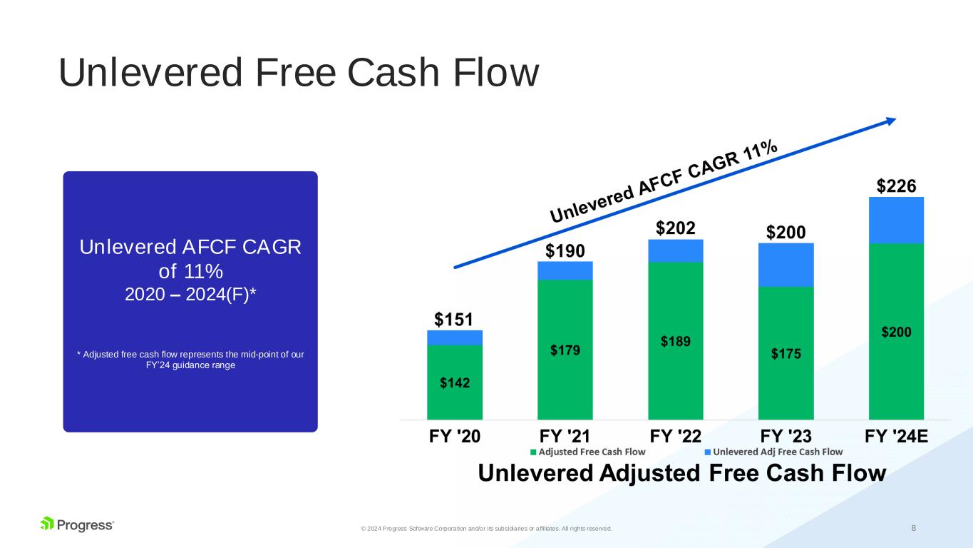 7© 2024 Progress Software Corporation and/or its subsidiaries or affiliates. All rights reserved. Operating Income CAGR of 13% 2020 – 2024(F)* Best-in-class non-GAAP operating margins consistently above 35% * Represents the mid-point of our FY’24 guidance range Growing Profitability