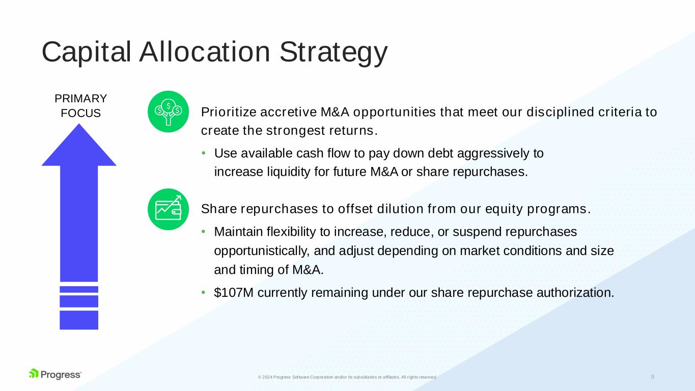 8© 2024 Progress Software Corporation and/or its subsidiaries or affiliates. All rights reserved. Unlevered Free Cash Flow Unlevered AFCF CAGR of 11% 2020 – 2024(F)* * Adjusted free cash flow represents the mid-point of our FY’24 guidance range