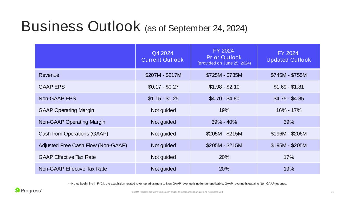 11© 2024 Progress Software Corporation and/or its subsidiaries or affiliates. All rights reserved. Summary Q3 2024 Financial Results Q3 2024 Results Prior Q3 2024 Outlook (provided on June 25, 2024) Revenue $179M $174M - $178M GAAP earnings per share (Diluted) $0.65 $0.48 - $0.52 Non-GAAP earnings per share (Diluted) $1.26 $1.11 - $1.15 GAAP Operating Margin 23% Not guided Non-GAAP Operating Margin 41% Not guided Adjusted Free Cash Flow (non-GAAP) $58M Not guided