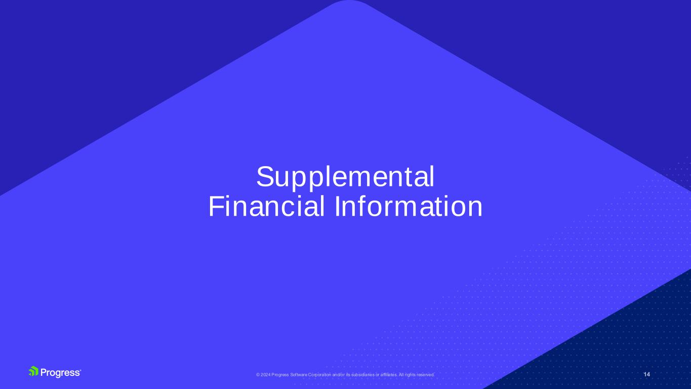 13© 2024 Progress Software Corporation and/or its subsidiaries or affiliates. All rights reserved. ShareFile Impact for Q4’24E and FY24E • Q4’24 guidance includes one month of ShareFile revenue, or $18M - $20M at 15% to 20% operating margin (non-GAAP). • We expect $15M - $20M negative cash flow in Q4’24 from ShareFile, due to deal structure: • Asset purchase deal structure excludes ShareFile A/R. • PRGS will receive a $25M working capital adjustment, which will net down the $875M cash purchase price to $850M. • We expect to draw down ~$750M from our revolving line of credit to fund the acquisition.