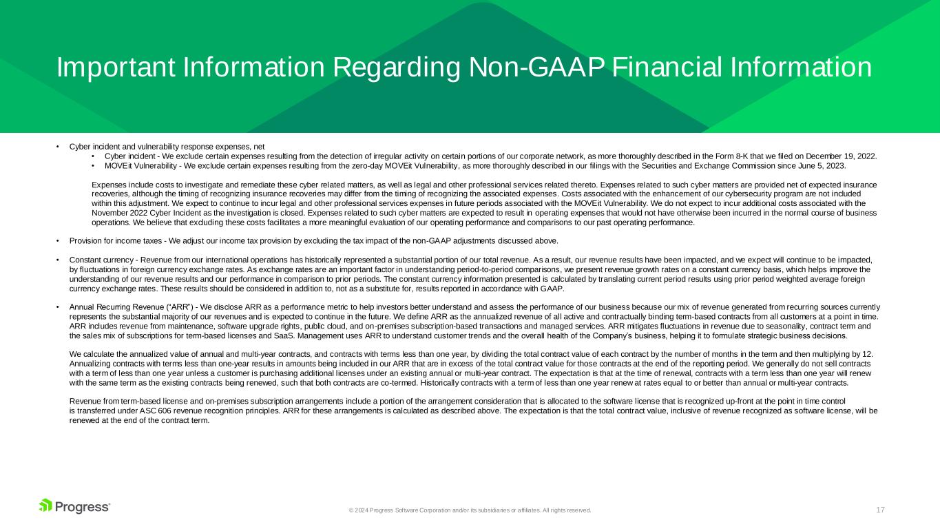 16© 2024 Progress Software Corporation and/or its subsidiaries or affiliates. All rights reserved. Progress furnishes certain non-GAAP supplemental information to our financial results. We use such non-GAAP financial measures to evaluate our period-over-period operating performance because our management team believes that by excluding the effects of certain GAAP-related items that in their opinion do not reflect the ordinary earnings of our operations, such information helps to illustrate underlying trends in our business and provides us with a more comparable measure of our continuing business, as well as greater understanding of the results from the primary operations of our business. Management also uses such non-GAAP financial measures to establish budgets and operational goals, evaluate performance, and allocate resources. In addition, the compensation of our executives and non-executive employees is based in part on the performance of our business as evaluated by such non-GAAP financial measures. We believe these non-GAAP financial measures enhance investors’ overall understanding of our current financial performance and our prospects for the future by: (i) providing more transparency for certain financial measures, (ii) presenting disclosure that helps investors understand how we plan and measure the performance of our business, (iii) affords a view of our operating results that may be more easily compared to our peer companies, and (iv) enables investors to consider our operating results on both a GAAP and non-GAAP basis (including following the integration period of our prior and proposed acquisitions). However, this non-GAAP information is not in accordance with, or an alternative to, generally accepted accounting principles in the United States (“GAAP”) and should be considered in conjunction with our GAAP results as the items excluded from the non-GAAP information may have a material impact on Progress’ financial results. A reconciliation between non-GAAP measures and the most directly comparable GAAP measures appears in our earnings press release for the fiscal quarter ended August 31, 2024, which is furnished on a Form 8-K concurrently with this presentation and is available on the Progress website at www.progress.com within the investor relations section. In this presentation, we may reference the following non-GAAP financial measures: • Acquisition-related revenue - We include acquisition-related revenue, which constitutes revenue reflected as pre-acquisition deferred revenue that would have been recognized prior to our adoption of Accounting Standards Update No. 2021-08, Business Combinations (Topic 805): Accounting for Contract Assets and Contract Liabilities from Contracts with Customers (“ASU 2021-08”) during the fourth quarter of fiscal year 2021. The acquisition-related revenue in our prior period results relates to Chef Software, Inc. which we acquired on October 5, 2020. Since GAAP accounting required the elimination of this revenue prior to the adoption of ASU 2021-08, GAAP results alone do not fully capture all of our economic activities. We believe these adjustments are useful to management and investors as a measure of the ongoing performance of the business because, although we cannot be certain that customers will renew their contracts, we have historically experienced high renewal rates on maintenance and support agreements and other customer contracts. Upon our adoption of ASU 2021-08, this adjustment is no longer applicable to subsequent acquisitions. • Amortization of acquired intangibles - We exclude amortization of acquired intangibles because those expenses are unrelated to our core operating performance and the intangible assets acquired vary significantly based on the timing and magnitude of our acquisition transactions and the maturities of the businesses acquired. • Stock-based compensation - We exclude stock-based compensation to be consistent with the way management and, in our view, the overall financial community evaluates our performance and the methods used by analysts to calculate consensus estimates. The expense related to stock-based awards is generally not controllable in the short-term and can vary significantly based on the timing, size and nature of awards granted. As such, we do not include these charges in operating plans. • Restructuring expenses and other - In all periods presented, we exclude restructuring expenses incurred because those expenses distort trends and are not part of our core operating results. • Acquisition-related expenses - We exclude acquisition-related expenses in order to provide a more meaningful comparison of the financial results to our historical operations and forward-looking guidance and the financial results of less acquisitive peer companies. We consider these types of costs and adjustments, to a great extent, to be unpredictable and dependent on a significant number of factors that are outside of our control. Furthermore, we do not consider these acquisition-related costs and adjustments to be related to the organic continuing operations of the acquired businesses and are generally not relevant to assessing or estimating the long-term performance of the acquired assets. In addition, the size, complexity and/or volume of past acquisitions, which often drives the magnitude of acquisition-related costs, may not be indicative of the size, complexity and/or volume of future acquisitions. Important Information Regarding Non-GAAP Financial Information