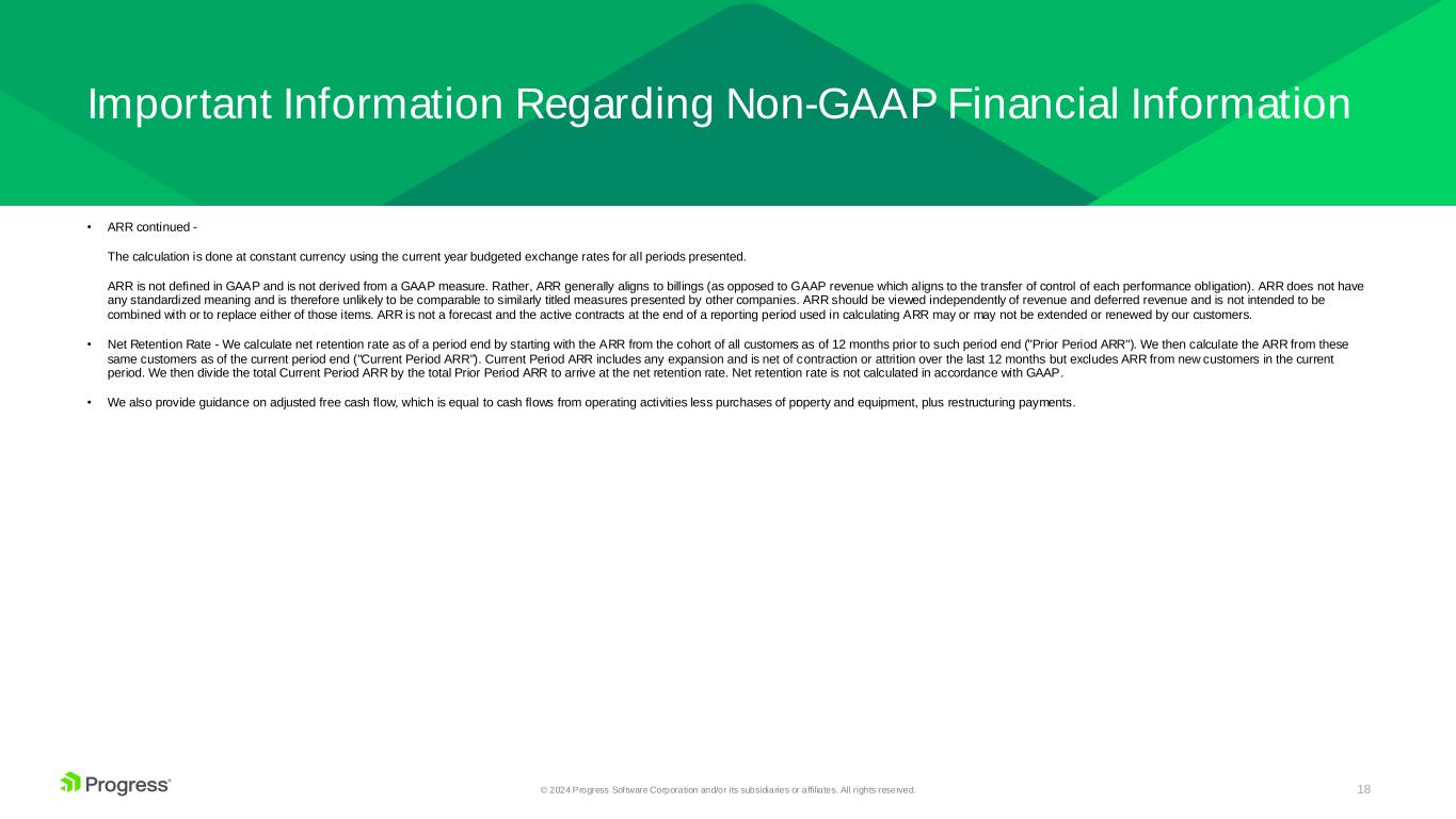 17© 2024 Progress Software Corporation and/or its subsidiaries or affiliates. All rights reserved. Important Information Regarding Non-GAAP Financial Information • Cyber incident and vulnerability response expenses, net • Cyber incident - We exclude certain expenses resulting from the detection of irregular activity on certain portions of our corporate network, as more thoroughly described in the Form 8-K that we filed on December 19, 2022. • MOVEit Vulnerability - We exclude certain expenses resulting from the zero-day MOVEit Vulnerability, as more thoroughly described in our filings with the Securities and Exchange Commission since June 5, 2023. Expenses include costs to investigate and remediate these cyber related matters, as well as legal and other professional services related thereto. Expenses related to such cyber matters are provided net of expected insurance recoveries, although the timing of recognizing insurance recoveries may differ from the timing of recognizing the associated expenses. Costs associated with the enhancement of our cybersecurity program are not included within this adjustment. We expect to continue to incur legal and other professional services expenses in future periods associated with the MOVEit Vulnerability. We do not expect to incur additional costs associated with the November 2022 Cyber Incident as the investigation is closed. Expenses related to such cyber matters are expected to result in operating expenses that would not have otherwise been incurred in the normal course of business operations. We believe that excluding these costs facilitates a more meaningful evaluation of our operating performance and comparisons to our past operating performance. • Provision for income taxes - We adjust our income tax provision by excluding the tax impact of the non-GAAP adjustments discussed above. • Constant currency - Revenue from our international operations has historically represented a substantial portion of our total revenue. As a result, our revenue results have been impacted, and we expect will continue to be impacted, by fluctuations in foreign currency exchange rates. As exchange rates are an important factor in understanding period-to-period comparisons, we present revenue growth rates on a constant currency basis, which helps improve the understanding of our revenue results and our performance in comparison to prior periods. The constant currency information presented is calculated by translating current period results using prior period weighted average foreign currency exchange rates. These results should be considered in addition to, not as a substitute for, results reported in accordance with GAAP. • Annual Recurring Revenue (“ARR”) - We disclose ARR as a performance metric to help investors better understand and assess the performance of our business because our mix of revenue generated from recurring sources currently represents the substantial majority of our revenues and is expected to continue in the future. We define ARR as the annualized revenue of all active and contractually binding term-based contracts from all customers at a point in time. ARR includes revenue from maintenance, software upgrade rights, public cloud, and on-premises subscription-based transactions and managed services. ARR mitigates fluctuations in revenue due to seasonality, contract term and the sales mix of subscriptions for term-based licenses and SaaS. Management uses ARR to understand customer trends and the overall health of the Company’s business, helping it to formulate strategic business decisions. We calculate the annualized value of annual and multi-year contracts, and contracts with terms less than one year, by dividing the total contract value of each contract by the number of months in the term and then multiplying by 12. Annualizing contracts with terms less than one-year results in amounts being included in our ARR that are in excess of the total contract value for those contracts at the end of the reporting period. We generally do not sell contracts with a term of less than one year unless a customer is purchasing additional licenses under an existing annual or multi-year contract. The expectation is that at the time of renewal, contracts with a term less than one year will renew with the same term as the existing contracts being renewed, such that both contracts are co-termed. Historically contracts with a term of less than one year renew at rates equal to or better than annual or multi-year contracts. Revenue from term-based license and on-premises subscription arrangements include a portion of the arrangement consideration that is allocated to the software license that is recognized up-front at the point in time control is transferred under ASC 606 revenue recognition principles. ARR for these arrangements is calculated as described above. The expectation is that the total contract value, inclusive of revenue recognized as software license, will be renewed at the end of the contract term.