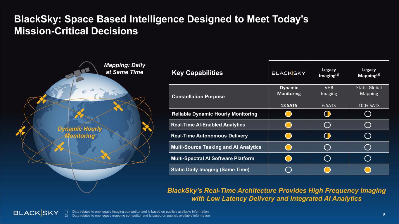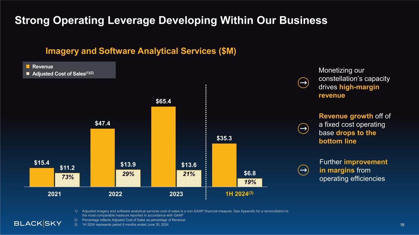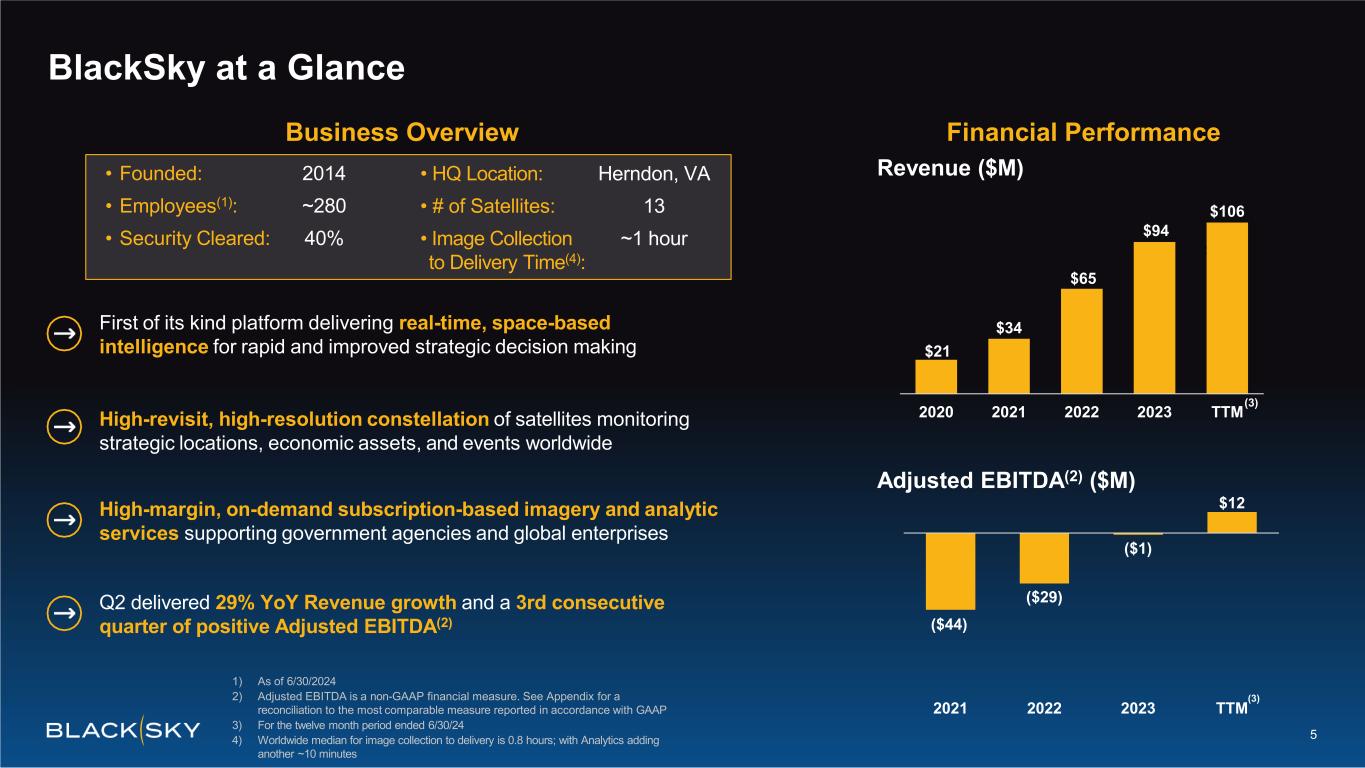 Legal Disclaimer 2 FORWARD-LOOKING STATEMENTS This presentation contains forward-looking statements within the meaning of Section 27A of the Securities Act of 1933, as amended, and Section 21E of the Securities Exchange Act of 1934, as amended, with respect to BlackSky Technology Inc “BlackSky” or the “Company”). Words such as “believe,” “project,” “expect,” “anticipate,” “estimate,” “intend,” “strategy,” “future,” “opportunity,” “plan,” “may,” “should,” “will,” “would,” “will be,” “will continue,” “will likely result,” or the negative of these words, and similar expressions are often intended to identify forward-looking statements, although not all forward-looking statements contain these identifying words. Forward-looking statements are predictions, projections, and other statements about future events that are based on current expectations and assumptions and, as a result, are subject to risks and uncertainties, some of which cannot be predicted or quantified. BlackSky cannot assure you that the results, events, and circumstances reflected in the forward-looking statements in this presentation will be achieved or occur. Many factors could cause actual future events to differ materially from the forward-looking statements in this presentation, including those described in the section captioned “Risk Factors” in Item 1A of our Annual Report on Form 10-K for the fiscal year ended December 31, 2023, filed with the Securities and Exchange Commission. If any of these risks materialize or underlying assumptions prove incorrect, actual results could differ materially from the results implied by these forward-looking statements. In addition, forward-looking statements reflect our expectations, plans, or forecasts of future events and views as of the date of this presentation. We anticipate that subsequent events and developments will cause our assessments to change. Accordingly, forward-looking statements should not be relied upon as representing our views as of any subsequent date, and we do not undertake any obligation to update forward-looking statements to reflect events or circumstances after the date they were made, whether as a result of new information, future events or otherwise, except as may be required under applicable securities laws. Additional risks and uncertainties are identified and discussed in BlackSky’s disclosure materials filed from time to time with the SEC which are available at the SEC’s website at http://www.sec.gov or on BlackSky’s Investor Relations website at https://ir.blacksky.com. This presentation and any information included in this presentation are strictly confidential and should not be discussed outside of your organization. This presentation shall not constitute an offer to sell or a solicitation of an offer to buy any securities and shall not constitute an offer, solicitation or sale in any state or jurisdiction in which such offer, solicitation or sale is not permitted. BlackSky has filed an effective shelf registration statement on Form S-3 (Registration No. 333-267889) with the U.S. Securities and Exchange Commission (the "SEC"). Any offering of securities would be made only by means of a prospectus supplement, which would be filed with the SEC. Before you invest, you should read the prospectus supplement and accompanying prospectus, including the risk factors set forth therein and incorporated by reference therein, and the documents incorporated by reference in or filed as exhibits to the registration statement, for more complete information about us and this proposed offering. You may access these documents for free by visiting EDGAR on the SEC website at www.sec.gov. Alternatively, copies of the prospectus supplement and accompanying prospectus may be obtained, when available, to Oppenheimer & Co. Inc., Attention: Syndicate Prospectus Department, 85 Broad Street, 26th Floor, New York, NY 10004, or by telephone at (212) 667-8055, or by email at EquityProspectus@opco.com. USE OF MODELING AND DATA The data contained herein is derived from various internal and external sources. All of the market data in the presentation involves a number of assumptions and limitations, and you are cautioned not to give undue weight to such data. BlackSky has not independently verified the data obtained from external sources. No representation is made as to the reasonableness or reliability of the assumptions made within or the accuracy or completeness of any projections or modeling or any other information contained herein. Any data on past performance or modeling contained herein is not an indication of future performance. BlackSky assumes no obligation to update the information in this presentation. TRADEMARKS BlackSky owns or has rights to various trademarks, service marks and trade names that it uses in connection with the operation of its businesses. This presentation may also contain trademarks, service marks, trade names and copyrights of third parties, which are the property of their respective owners. The use or display of third parties’ trademarks, service marks, trade names or products in this presentation is not intended to, and does not imply, a relationship with BlackSky, or an endorsement or sponsorship by or of BlackSky. Solely for convenience, the trademarks, service marks, trade names and copyrights referred to in this presentation may appear without the TM, SM, ® or © symbols, but such references are not intended to indicate, in any way, that BlackSky will not assert, to the fullest extent under applicable law, its rights or the right of the applicable licensor to these trademarks, service marks, trade names and copyrights. NON-GAAP FINANCIAL MEASURES In addition to results determined in accordance with U.S. generally accepted accounting principles (“GAAP”), this presentation contains Adjusted EBITDA, Adjusted EBITDA Margin, and Adjusted Imagery and Software