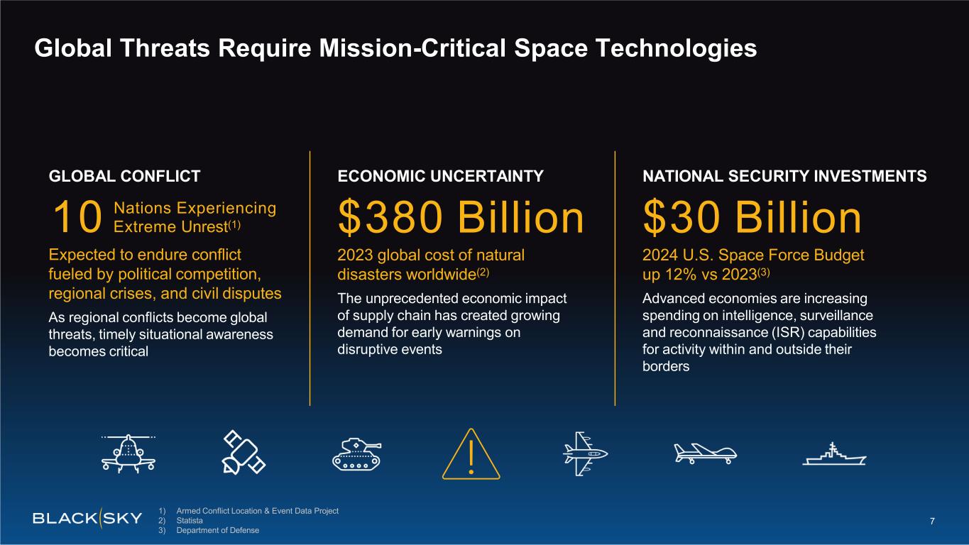 Recent Achievements 6 Selected by NASA for Commercial SmallSat Services Award up to $476 million(1) on September 6th Awarded $40 million in new awards and extension agreements in Q2 supporting multiple U.S. and international government agencies First high resolution Gen-3 Satellite in final stages of assembly, integration, and testing (1) IDIQ Contract BlackSky wins new NGA contract for AI analytics valued at up to $290 million(1) on September 13th First very-high resolution Gen-3 satellite planned for launch in Q4