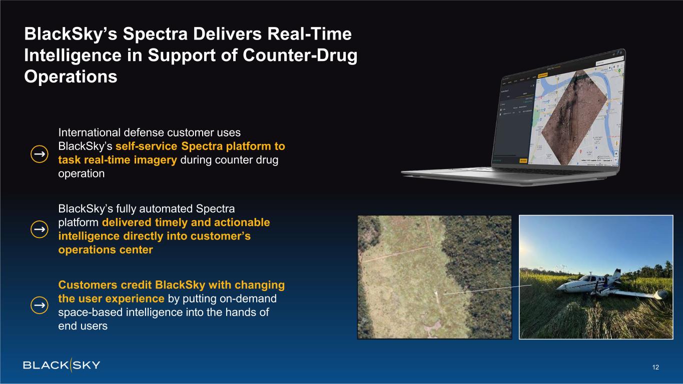 11 BlackSky Solutions Support a Range of Industry Applications Responsive tactical ISR for an edge on the ground Site monitoring for persistent situational awareness Indications and warning to streamline broad area search Space domain awareness for insight into in-space capabilities Moving target engagement to characterize targets in real time Automated AI for activity-based intelligence