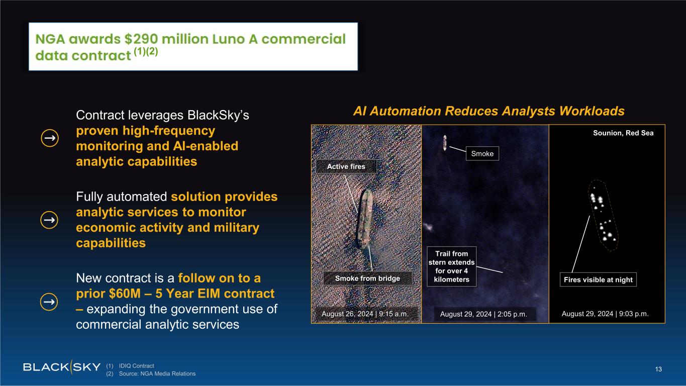 13 Contract leverages BlackSky’s proven high-frequency monitoring and AI-enabled analytic capabilities Fully automated solution provides analytic services to monitor economic activity and military capabilities New contract is a follow on to a prior $60M – 5 Year EIM contract – expanding the government use of commercial analytic services (1) IDIQ Contract (2) Source: NGA Media Relations AI Automation Reduces Analysts Workloads Active fires Smoke from bridge Smoke Trail from stern extends for over 4 kilometers Fires visible at night August 29, 2024 | 2:05 p.m.August 26, 2024 | 9:15 a.m. Sounion, Red Sea August 29, 2024 | 9:03 p.m. (1)(2)