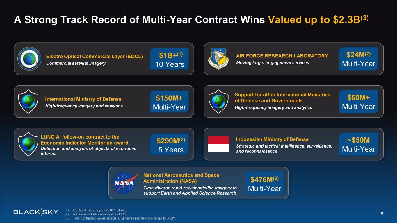 1) Contract valued up to $1.021 billion 2) Represents total ceiling value of IDIQ 3) Total contracted values include IDIQ figures (not fully contracted to BKSY) A Strong Track Record of Multi-Year Contract Wins Valued up to $2.3B(3) 16 Electro Optical Commercial Layer (EOCL) Commercial satellite imagery $1B+(1) 10 Years $24M(2) Multi-Year AIR FORCE RESEARCH LABORATORY Moving target engagement services National Aeronautics and Space Administration (NASA) Time-diverse rapid-revisit satellite imagery to support Earth and Applied Science Research $476M(2) Multi-Year Indonesian Ministry of Defense Strategic and tactical intelligence, surveillance, and reconnaissance ~$50M Multi-Year LUNO A, follow-on contract to the Economic Indicator Monitoring award Detection and analysis of objects of economic interest $290M(2) 5 Years $150M+ Multi-Year International Ministry of Defense High-frequency imagery and analytics $60M+ Multi-Year Support for other International Ministries of Defense and Governments High-frequency imagery and analytics