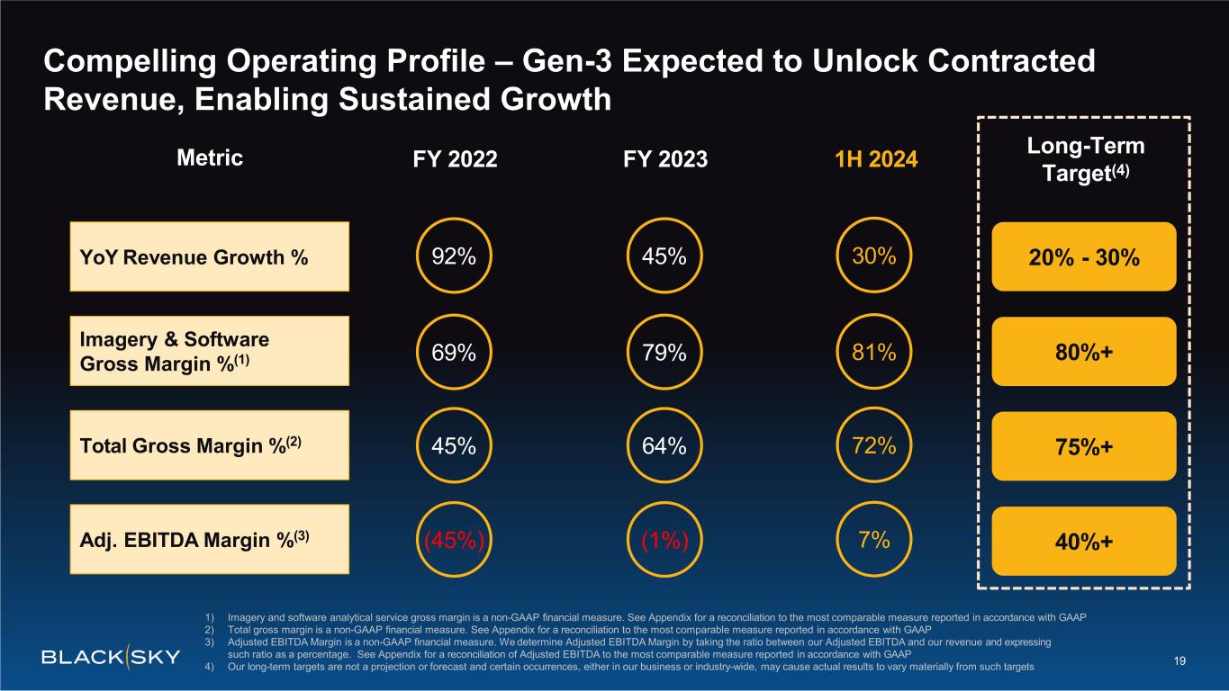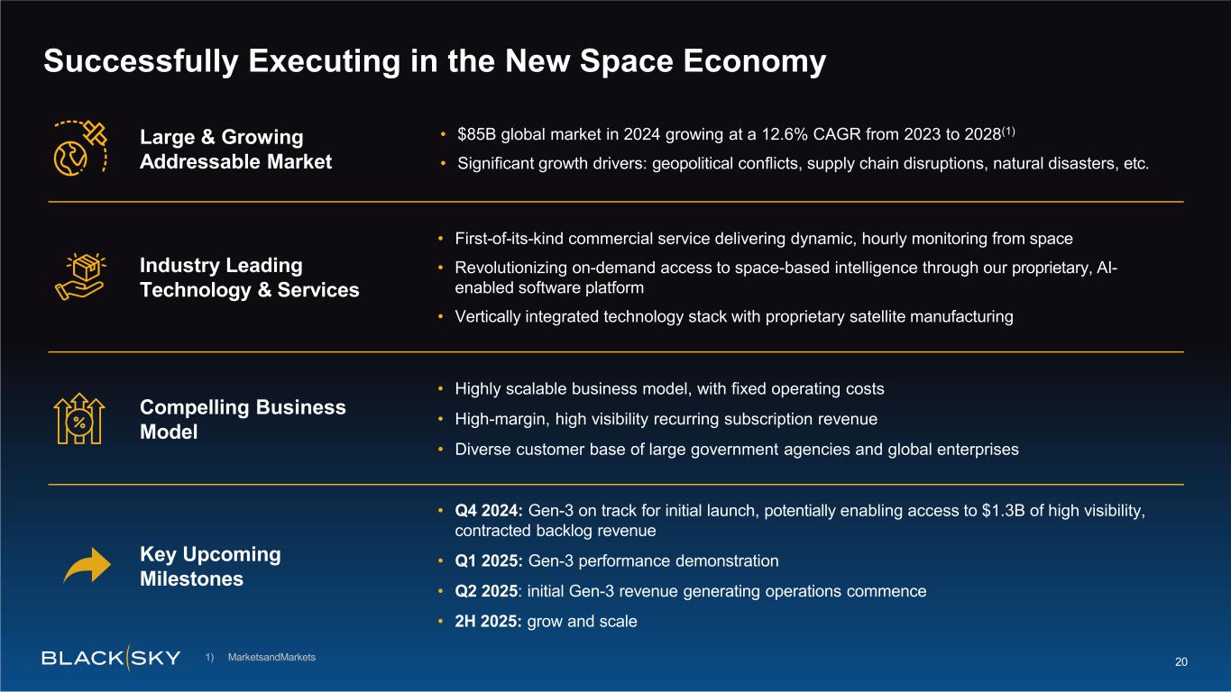 FY 2022 FY 2023 1H 2024 Long-Term Target(4) 81% Compelling Operating Profile – Gen-3 Expected to Unlock Contracted Revenue, Enabling Sustained Growth 19 Metric YoY Revenue Growth % 92% 69% 45% (45%) 45% 79% 64% (1%) 1) Imagery and software analytical service gross margin is a non-GAAP financial measure. See Appendix for a reconciliation to the most comparable measure reported in accordance with GAAP 2) Total gross margin is a non-GAAP financial measure. See Appendix for a reconciliation to the most comparable measure reported in accordance with GAAP 3) Adjusted EBITDA Margin is a non-GAAP financial measure. We determine Adjusted EBITDA Margin by taking the ratio between our Adjusted EBITDA and our revenue and expressing such ratio as a percentage. See Appendix for a reconciliation of Adjusted EBITDA to the most comparable measure reported in accordance with GAAP 4) Our long-term targets are not a projection or forecast and certain occurrences, either in our business or industry-wide, may cause actual results to vary materially from such targets 30% 72% 7% Imagery & Software Gross Margin %(1) Total Gross Margin %(2) Adj. EBITDA Margin %(3) 20% - 30% 80%+ 75%+ 40%+