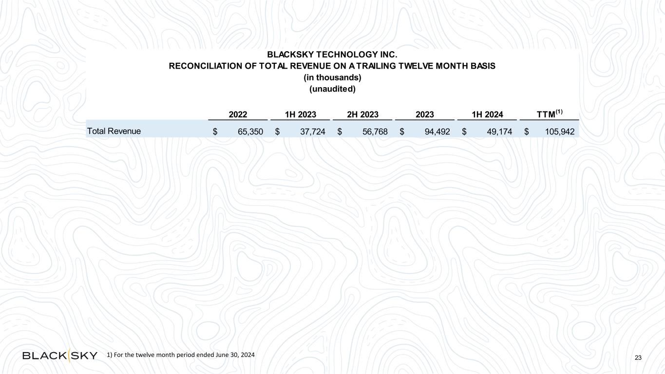 231) For the twelve month period ended June 30, 2024 2022 1H 2023 2H 2023 2023 1H 2024 TTM(1) Total Revenue 65,350$ 37,724$ 56,768$ 94,492$ 49,174$ 105,942$ BLACKSKY TECHNOLOGY INC. RECONCILIATION OF TOTAL REVENUE ON A TRAILING TWELVE MONTH BASIS (in thousands) (unaudited)