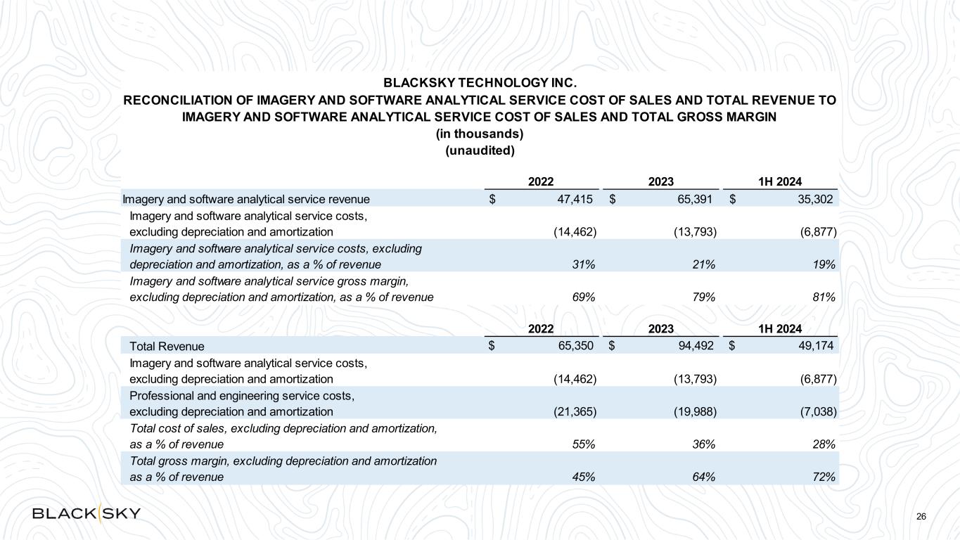 25 2021 2022 2023 1H 2024 Imagery and software analytical service costs, excluding depreciation and amortization 13,013$ 14,462$ 13,793$ 6,877$ Stock-based compensation for imagery and software analytical service costs (1,824) (553) (242) (104) Adjusted imagery and software analytical service costs, excluding depreciation and amortization 11,189$ $13,909 $13,551 6,773$ BLACKSKY TECHNOLOGY INC. RECONCILIATION OF IMAGERY AND SOFTWARE ANALYTICAL SERVICE COST OF SALES TO ADJUSTED IMAGERY AND SOFTWARE ANALYTICAL SERVICE COST OF SALES (in thousands) (unaudited)