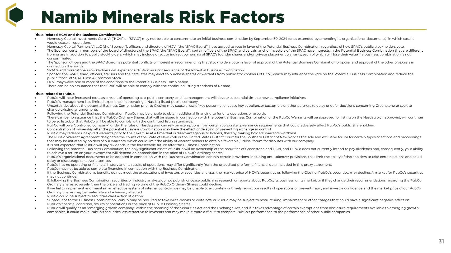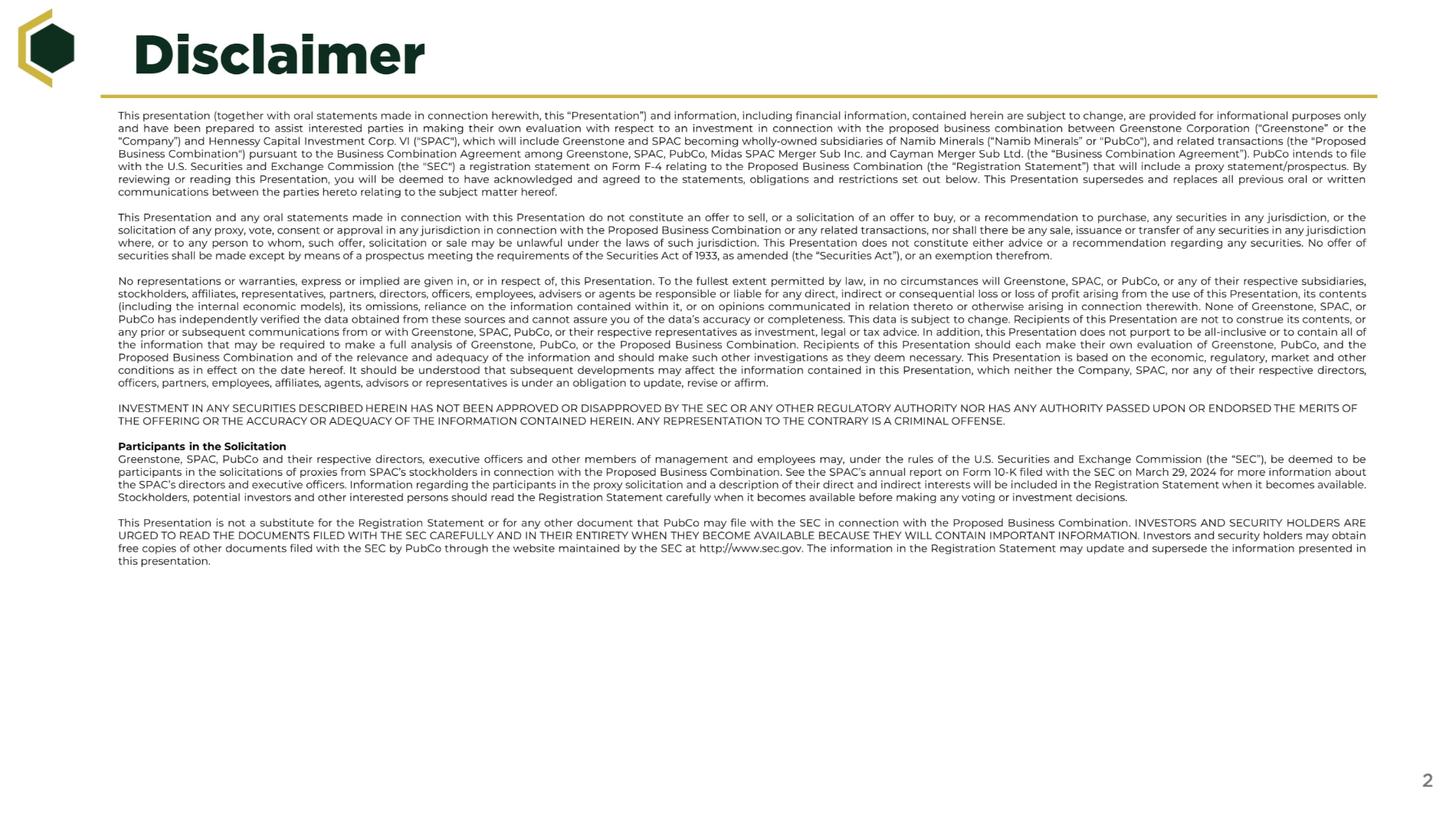 As previously reported, on June 17, 2024, Hennessy Capital Investment Corp. VI, a Delaware corporation (“SPAC”), Namib Minerals, an exempted company limited by shares incorporated under the laws of the Cayman Islands (“PubCo”), Midas SPAC Merger Sub Inc., a Delaware corporation and a direct wholly-owned subsidiary of PubCo, Cayman Merger Sub Ltd., an exempted company limited by shares incorporated under the laws of the Cayman Islands and a direct wholly-owned subsidiary of PubCo, and Greenstone Corporation, an exempted company limited by shares incorporated under the laws of the Cayman Islands (the “Company” or “Greenstone”), entered into a business combination agreement (the “Business Combination Agreement”), pursuant to which, the parties thereto will enter into a business combination transaction (the “Business Combination”).
