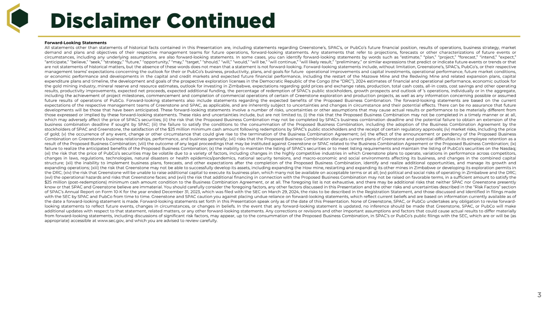 This Current Report includes, or incorporates by reference, forward-looking statements. All statements other than statements of historical facts contained in this Current Report are forward-looking statements. Any statements that refer to projections, forecasts or other characterizations of future events or circumstances, including any underlying assumptions, are also forward-looking statements. In some cases, you can identify forward-looking statements by words such as “estimate,” “plan,” “project,” “forecast,” “intend,” “expect,” “anticipate,” “believe,” “seek,” “strategy,” “future,” “opportunity,” “may,” “target,” “should,” “will,” “would,” “will be,” “will continue,” “will likely result,” “preliminary,” or similar expressions that predict or indicate future events or trends or that are not statements of historical matters, but the absence of these words does not mean that a statement is not forward-looking. Forward-looking statements include, without limitation, Greenstone’s, SPAC’s, PubCo’s, or their respective management teams’ expectations concerning the outlook for their or PubCo’s business, productivity, plans, and goals for future operational improvements and capital investments, operational performance, future market conditions, or economic performance and developments in the capital and credit markets and expected future financial performance, including the restart of Greenstone’s Mazowe mine and Redwing mine and related expansion plans, capital expenditure plans and timeline, the development and goals of the prospective exploration licenses in the Democratic Republic of Congo (the “DRC”), 2024 estimates of financial and operational performance, economic outlook for the gold mining industry, mineral reserve and resource estimates, outlook for investing in Zimbabwe, expectations regarding gold prices and exchange rates, production, total cash costs, all-in costs, cost savings and other operating results, productivity improvements, expected net proceeds, expected additional funding, the percentage of redemption of SPAC’s public stockholders, growth prospects and outlook of PubCo’s operations, individually or in the aggregate, including the achievement of project milestones, commencement and completion of commercial operations of certain of Greenstone’s exploration and production projects, as well as any information concerning possible or assumed future results of operations of PubCo. Forward-looking statements also include statements regarding the expected benefits of the Business Combination. The forward-looking statements are based on the current expectations of the respective management teams of PubCo and SPAC, as applicable, and are inherently subject to uncertainties and changes in circumstance and their potential effects. There can be no assurance that future developments will be those that have been anticipated. These forward-looking statements involve a number of risks, uncertainties or other assumptions that may cause actual results or performance to be materially different from those expressed or implied by these forward-looking statements. These risks and uncertainties include, but are not limited to, (i) the risk that the Business Combination may not be completed in a timely manner or at all, which may adversely affect the price of SPAC’s securities; (ii) the risk that the Business Combination may not be completed by SPAC’s business combination deadline and the potential failure to obtain an extension of the business combination deadline currently sought by SPAC; (iii) the failure to satisfy the conditions to the consummation of the Business Combination, including the adoption of the Business Combination Agreement by the stockholders of SPAC and Greenstone, the satisfaction of the $25 million minimum cash amount condition to the Business Combination Agreement following redemptions by SPAC’s public stockholders and the receipt of certain regulatory approvals; (iv) market risks, including the price of gold; (v) the occurrence of any event, change or other circumstance that could give rise to the termination of the Business Combination Agreement; (vi) the effect of the announcement or pendency of the Business Combination on Greenstone’s business relationships, performance, and business generally; (vii) risks that the Business Combination disrupts current plans of Greenstone and potential difficulties in its employee retention as a result of the Business Combination; (viii) the outcome of any legal proceedings that may be instituted against Greenstone, PubCo or SPAC related to the Business Combination Agreement or the Business Combination; (ix) failure to realize the anticipated benefits of the Business Combination; (x) the inability to maintain the listing of SPAC’s securities or to meet listing requirements and maintain the listing of PubCo’s securities on the Nasdaq; (xi) the risk that the price of PubCo’s securities may be volatile due to a variety of factors, including changes in the highly competitive industries in which PubCo plans to operate, variations in performance across competitors, changes in laws, regulations, technologies, natural disasters or health epidemics/pandemics, national security tensions, and macro-economic and social environments affecting its business, and changes in the combined capital structure; (xii) the inability to implement business plans, forecasts, and other expectations after the completion of the Business Combination, identify and realize additional opportunities, and manage growth and expanding operations; (xiii) the risk that PubCo may not be able to successfully develop its assets, including expanding the How Mine, restarting and expanding its other mines in Zimbabwe or developing its exploration permits in the DRC; (xiv) the risk that PubCo will be unable to raise additional capital to execute its business pla