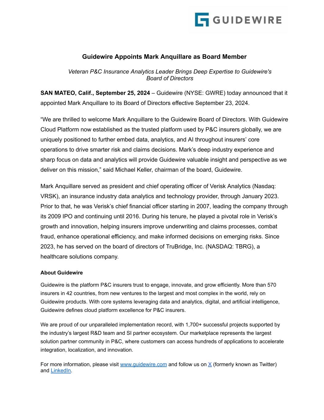 Guidewire Appoints Mark Anquillare as Board Member Veteran P&C Insurance Analytics Leader Brings Deep Expertise to Guidewire's Board of Directors SAN MATEO, Calif., September 25, 2024 – Guidewire (NYSE: GWRE) today announced that it appointed Mark Anquillare to its Board of Directors effective September 23, 2024. “We are thrilled to welcome Mark Anquillare to the Guidewire Board of Directors. With Guidewire Cloud Platform now established as the trusted platform used by P&C insurers globally, we are uniquely positioned to further embed data, analytics, and AI throughout insurers’ core operations to drive smarter risk and claims decisions. Mark’s deep industry experience and sharp focus on data and analytics will provide Guidewire valuable insight and perspective as we deliver on this mission,” said Michael Keller, chairman of the board, Guidewire. Mark Anquillare served as president and chief operating officer of Verisk Analytics (Nasdaq: VRSK), an insurance industry data analytics and technology provider, through January 2023. Prior to that, he was Verisk’s chief financial officer starting in 2007, leading the company through its 2009 IPO and continuing until 2016. During his tenure, he played a pivotal role in Verisk’s growth and innovation, helping insurers improve underwriting and claims processes, combat fraud, enhance operational efficiency, and make informed decisions on emerging risks. Since 2023, he has served on the board of directors of TruBridge, Inc. (NASDAQ: TBRG), a healthcare solutions company. About Guidewire Guidewire is the platform P&C insurers trust to engage, innovate, and grow efficiently. More than 570 insurers in 42 countries, from new ventures to the largest and most complex in the world, rely on Guidewire products. With core systems leveraging data and analytics, digital, and artificial intelligence, Guidewire defines cloud platform excellence for P&C insurers. We are proud of our unparalleled implementation record, with 1,700+ successful projects supported by the industry’s largest R&D team and SI partner ecosystem. Our marketplace represents the largest solution partner community in P&C, where customers can access hundreds of applications to accelerate integration, localization, and innovation. For more information, please visit www.guidewire.com and follow us on X (formerly known as Twitter) and LinkedIn.