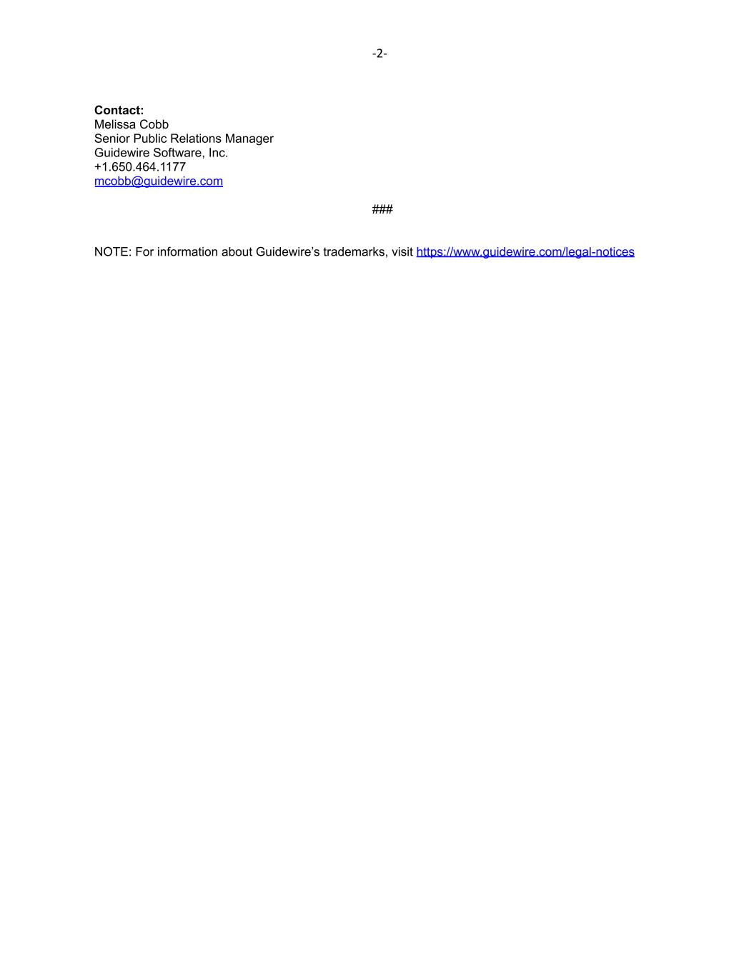 -2- Contact: Melissa Cobb Senior Public Relations Manager Guidewire Software, Inc. +1.650.464.1177 mcobb@guidewire.com ### NOTE: For information about Guidewire’s trademarks, visit https://www.guidewire.com/legal-notices