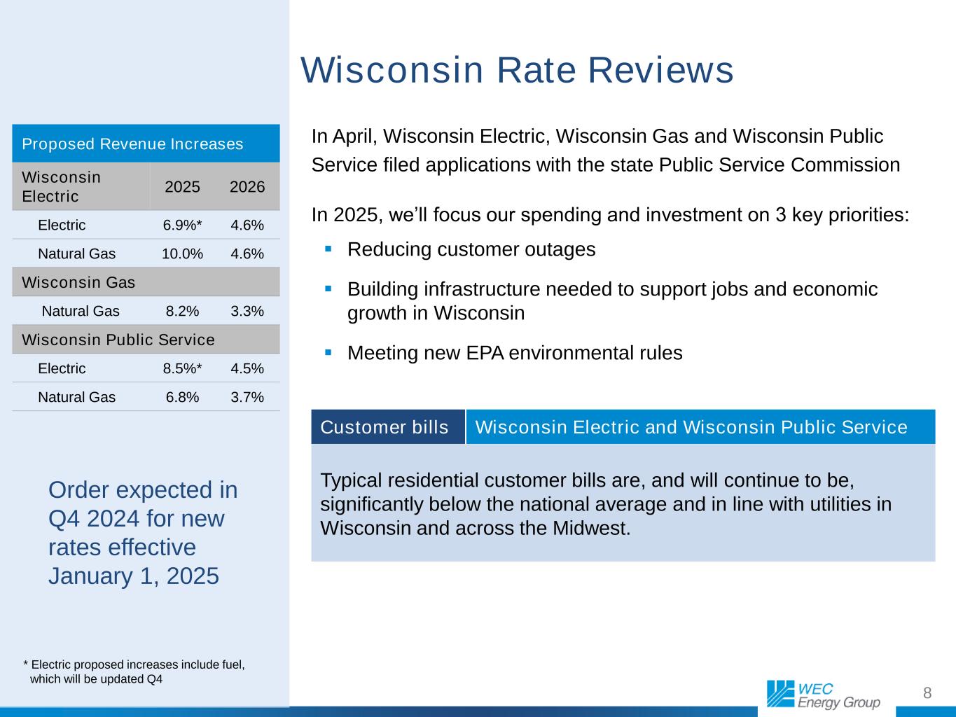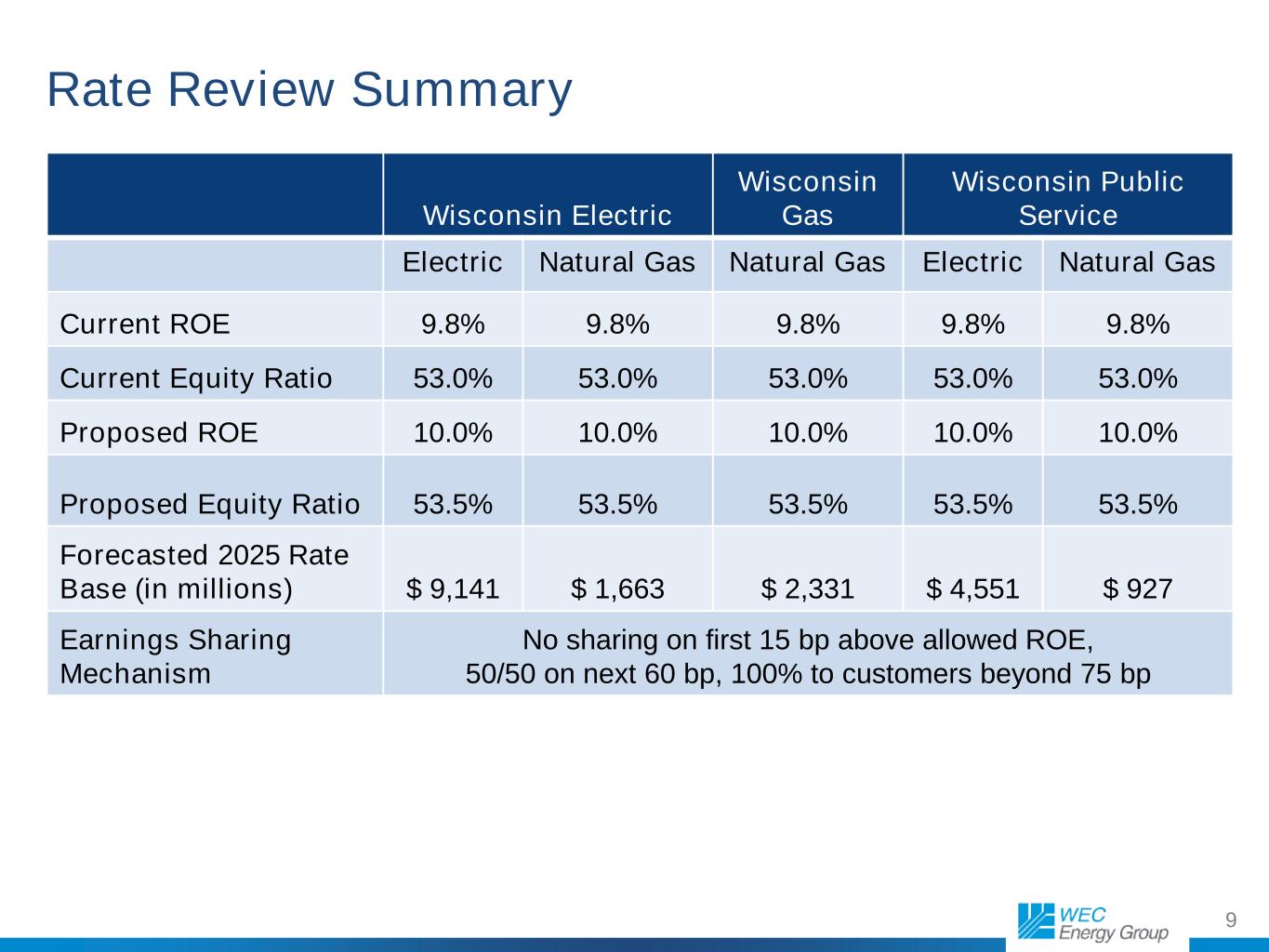 8 Wisconsin Rate Reviews In April, Wisconsin Electric, Wisconsin Gas and Wisconsin Public Service filed applications with the state Public Service Commission In 2025, we’ll focus our spending and investment on 3 key priorities: Reducing customer outages Building infrastructure needed to support jobs and economic growth in Wisconsin Meeting new EPA environmental rules * Electric proposed increases include fuel, which will be updated Q4 Proposed Revenue Increases Wisconsin Electric 2025 2026 Electric 6.9%* 4.6% Natural Gas 10.0% 4.6% Wisconsin Gas Natural Gas 8.2% 3.3% Wisconsin Public Service Electric 8.5%* 4.5% Natural Gas 6.8% 3.7% Customer bills Wisconsin Electric and Wisconsin Public Service Typical residential customer bills are, and will continue to be, significantly below the national average and in line with utilities in Wisconsin and across the Midwest. Order expected in Q4 2024 for new rates effective January 1, 2025