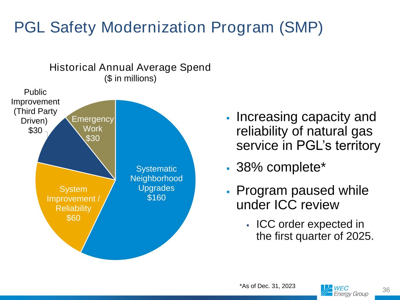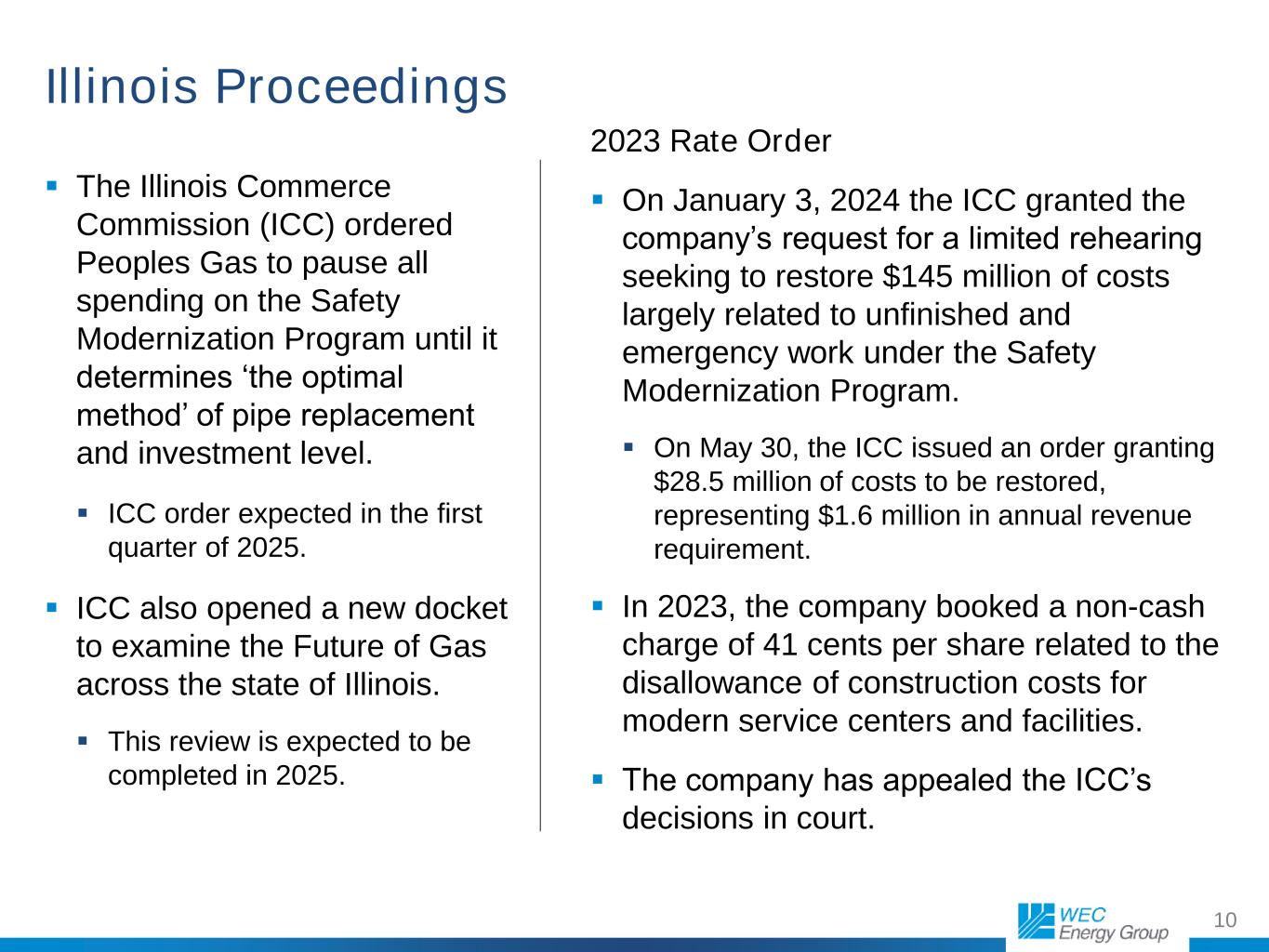 10 The Illinois Commerce Commission (ICC) ordered Peoples Gas to pause all spending on the Safety Modernization Program until it determines ‘the optimal method’ of pipe replacement and investment level. ICC order expected in the first quarter of 2025. ICC also opened a new docket to examine the Future of Gas across the state of Illinois. This review is expected to be completed in 2025. Illinois Proceedings 2023 Rate Order On January 3, 2024 the ICC granted the company’s request for a limited rehearing seeking to restore $145 million of costs largely related to unfinished and emergency work under the Safety Modernization Program. On May 30, the ICC issued an order granting $28.5 million of costs to be restored, representing $1.6 million in annual revenue requirement. In 2023, the company booked a non-cash charge of 41 cents per share related to the disallowance of construction costs for modern service centers and facilities. The company has appealed the ICC’s decisions in court.