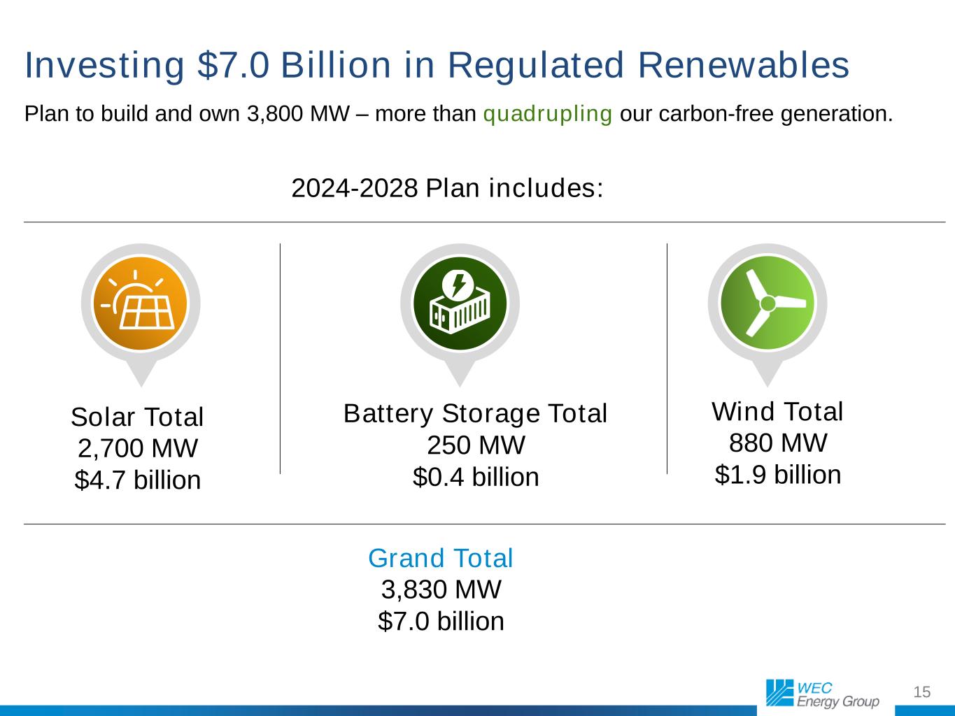 14 We plan to eliminate coal as an energy source by end of 2032. Retired: Oak Creek Units 5-6: 528 MW (May 31, 2024) Retirements planned: Oak Creek Units 7-8: 611 MW (late in 2025) Columbia Units 1-2: 300 MW (by June 1, 2026) Weston Unit 3: 328 MW (end of 2031) Enhancing fuel flexibility (gas blending) at Oak Creek Power the Future units and Weston Unit 4. By end of 2030, we expect to use coal only as a backup fuel. Exiting Coal