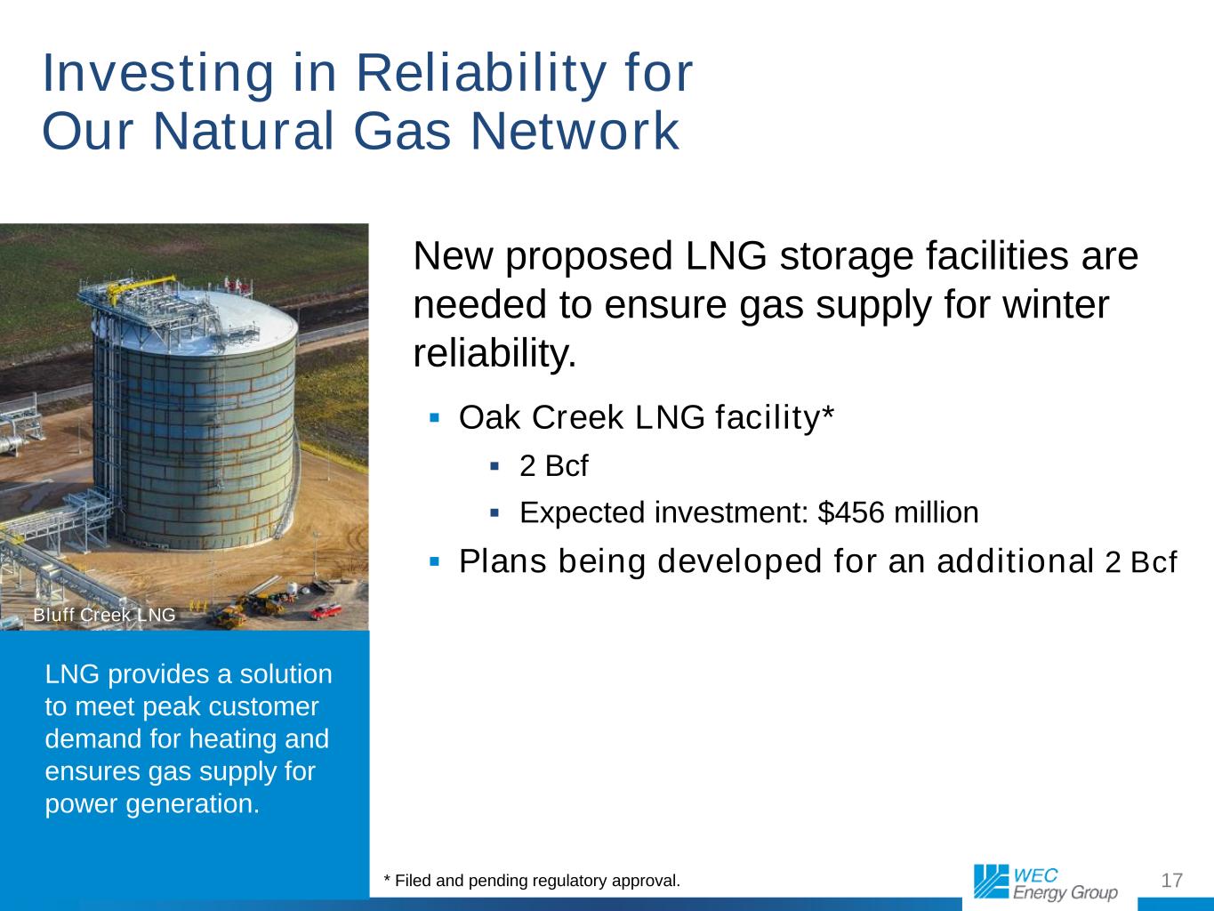 17 Investing in Reliability for Our Natural Gas Network New proposed LNG storage facilities are needed to ensure gas supply for winter reliability. Oak Creek LNG facility* 2 Bcf Expected investment: $456 million Plans being developed for an additional 2 Bcf LNG provides a solution to meet peak customer demand for heating and ensures gas supply for power generation. * Filed and pending regulatory approval. Bluff Creek LNG