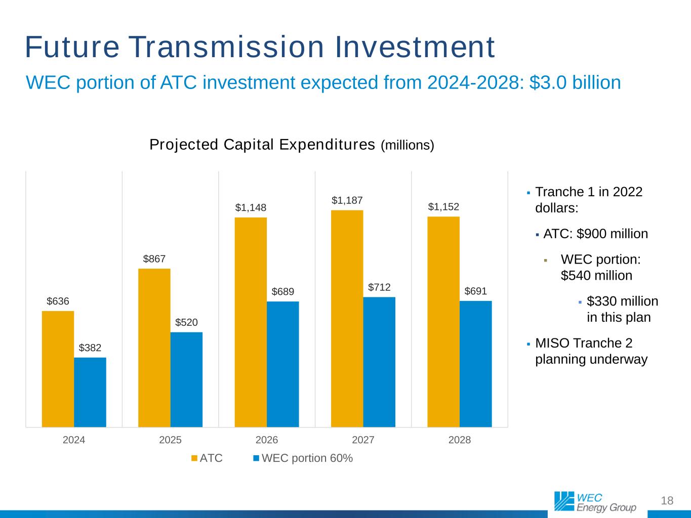 2 Cautionary Statement Regarding Forward-Looking Information Much of the information contained in this presentation is forward-looking information based upon management’s current expectations and projections that involve risks and uncertainties. Forward-looking information includes, among other things, information concerning earnings per share, rate case activity, earnings per share growth, cash flow, sources of revenue, dividend growth and dividend payout ratios, sales volumes, capital plans, credit ratings, credit metrics, debt-financings, construction costs, investment opportunities, corporate initiatives (including the ESG Progress Plan), rate base, and environmental matters (including emission reductions). Readers are cautioned not to place undue reliance on this forward-looking information. Forward-looking information is not a guarantee of future performance and actual results may differ materially from those set forth in the forward-looking information. Factors that could cause actual results to differ materially from those contemplated in any forward-looking statements include, but are not limited to: general economic conditions, including business and competitive conditions in the company’s service territories; timing, resolution and impact of rate cases and other regulatory decisions, including rider reconciliations; the company’s ability to continue to successfully integrate the operations of its subsidiaries; availability of the company’s generating facilities and/or distribution systems; unanticipated changes in fuel and purchased power costs; key personnel changes; unusual, varying or severe weather conditions; continued industry restructuring and consolidation; continued advances in, and adoption of, new technologies that produce power or reduce power consumption; energy and environmental conservation efforts; electrification initiatives, mandates and other efforts to reduce the use of natural gas; the company’s ability to successfully acquire and/or dispose of assets and projects and to execute on its capital plan; terrorist, physical or cyber-security threats or attacks and data security breaches; construction risks; labor disruptions; equity and bond market fluctuations; changes in the company’s and its subsidiaries’ ability to access the capital markets; changes in tax legislation or our ability to use certain tax benefits and carryforwards; federal, state, and local legislative and regulatory changes, including changes in rate-setting policies or procedures and environmental standards, the enforcement of these laws and regulations or permit conditions and changes in the interpretation of regulations by regulatory agencies; supply chain disruptions; inflation; political or geopolitical developments, including impacts on the global economy, supply chain and fuel prices, generally, from ongoing, escalating, or expanding regional conflicts; the impact from any health crises, including epidemics and pandemics; current and future litigation and regulatory investigations, proceedings or inquiries; changes in accounting standards; the financial performance of the American Transmission Company as well as projects in which the company’s energy infrastructure business invests; the ability of the company to obtain additional generating capacity at competitive prices; goodwill and its possible impairment; and other factors described under the heading “Factors Affecting Results, Liquidity and Capital Resources” in Management’s Discussion and Analysis of Financial Condition and Results of Operations and under the headings “Cautionary Statement Regarding Forward-Looking Information” and “Risk Factors” contained in WEC Energy Group’s Form 10-K for the year ended December 31, 2023, and in subsequent reports filed with the Securities and Exchange Commission. Except as may be required by law, WEC Energy Group expressly disclaims any obligation to publicly update or revise any forward-looking information.