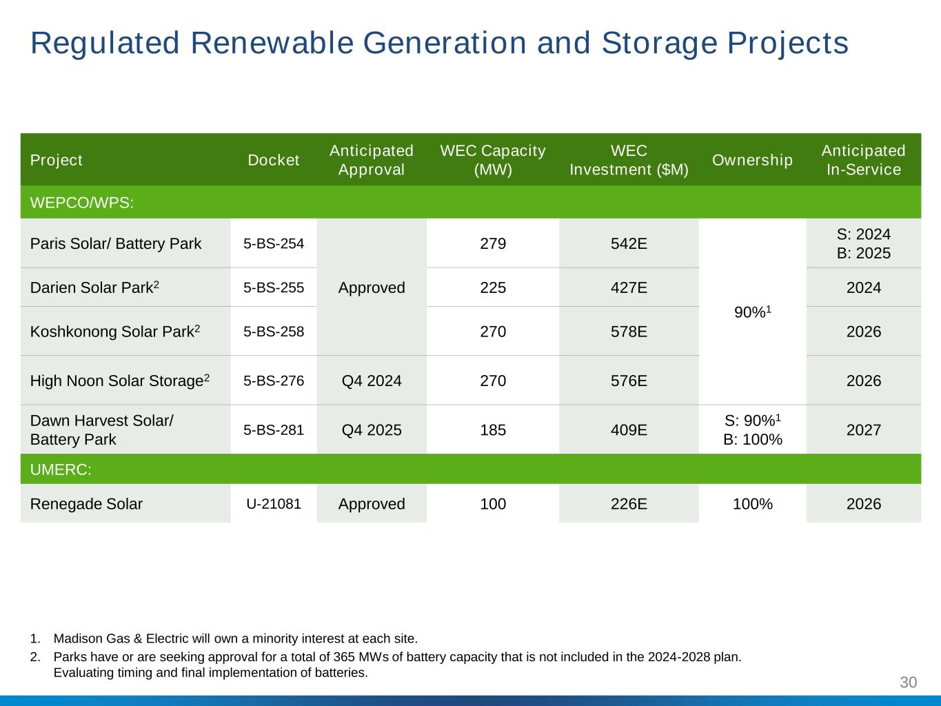 30 Project Docket Anticipated Approval WEC Capacity (MW) WEC Investment ($M) Ownership Anticipated In-Service WEPCO/WPS: Paris Solar/ Battery Park 5-BS-254 Approved 279 542E 90%1 S: 2024 B: 2025 Darien Solar Park2 5-BS-255 225 427E 2024 Koshkonong Solar Park2 5-BS-258 270 578E 2026 High Noon Solar Storage2 5-BS-276 Q4 2024 270 576E 2026 Dawn Harvest Solar/ Battery Park 5-BS-281 Q4 2025 185 409E S: 90%1 B: 100% 2027 UMERC: Renegade Solar U-21081 Approved 100 226E 100% 2026 Regulated Renewable Generation and Storage Projects 1. Madison Gas & Electric will own a minority interest at each site. 2. Parks have or are seeking approval for a total of 365 MWs of battery capacity that is not included in the 2024-2028 plan. Evaluating timing and final implementation of batteries.