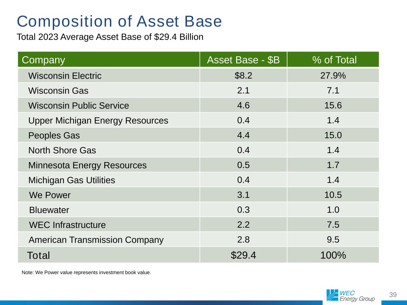 38 Company 2024 2025 2026 Wisconsin Electric $1,740.0 $2,035.7 $2,235.5 Wisconsin Gas 228.1 227.7 274.5 Wisconsin Public Service 636.4 799.5 933.4 Upper Michigan Energy 32.1 90.6 140.4 Wisconsin Segment $2,636.6 $3,153.5 $3,583.8 Peoples Gas 379.7 330.8 457.6 North Shore Gas 49.2 61.7 43.7 Illinois Segment $428.9 $392.5 $501.3 Minnesota Energy Resources 56.7 53.3 61.0 Michigan Gas Utilities 66.8 50.8 48.9 Other States Segment $123.5 $104.1 $109.9 We Power 29.5 29.8 29.2 Bluewater 1.2 1.7 0.6 Infrastructure Investments 918.1 255.1 0.0 Nonutility Energy Infrastructure $948.8 $286.6 $29.8 Corporate and Other $21.9 $14.0 $2.0 Subtotal $4,159.7 $3,950.7 $4,226.8 ATC Investment* $381.8 $520.4 $688.4 Total WEC Capital Projection $4,541.5 $4,471.10 $4,915.2 Capital Plan Projections ($ in millions) * ATC is accounted for using the equity method; this represents WEC Energy Group’s portion of the investment.