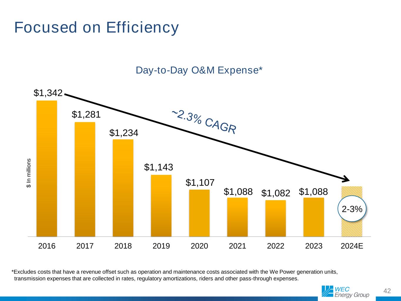 41 National Leader in Operating Efficiency and Financial Discipline $29.47 $12.20 $17.50 $18.40 $18.50 $21.10 $22.00 $24.00 $25.40 $42.70 $92.90 $0 $10 $20 $30 $40 $50 $60 $70 $80 $90 2023 Non-Fuel O&M per MWh* Source: FERC Form 1 Reports *For all companies, excluded 1) pensions and other employee benefits, 2) costs reported as “transmission of electricity by others” to neutralize differences in ownership of the transmission utilized by each utility, and 3) costs reported as “rents” within the production section to control for difference in how power plants are owned and financed. The top 10 vertically integrated electric utilities by 12/31/2023 market cap W E C A V E R A G E