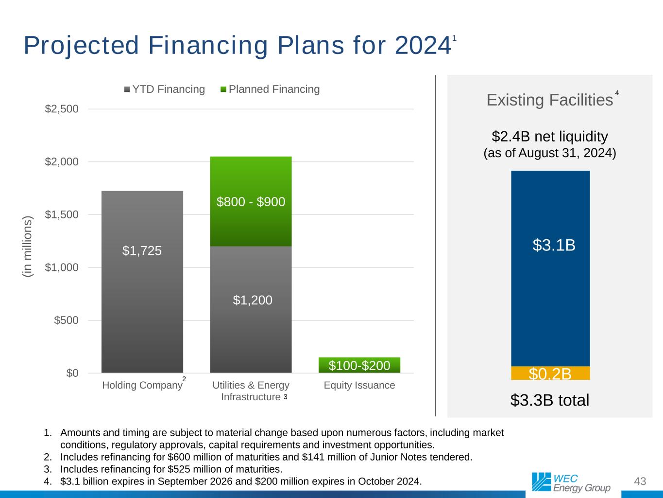 43 Projected Financing Plans for 2024 1 $800 - $900 $100-$200 $0 $500 $1,000 $1,500 $2,000 $2,500 Holding Company Utilities & Energy Infrastructure Equity Issuance (i n m ill io n s ) YTD Financing Planned Financing $1,725 2 1. Amounts and timing are subject to material change based upon numerous factors, including market conditions, regulatory approvals, capital requirements and investment opportunities. 2. Includes refinancing for $600 million of maturities and $141 million of Junior Notes tendered. 3. Includes refinancing for $525 million of maturities. 4. $3.1 billion expires in September 2026 and $200 million expires in October 2024. 3 Existing Facilities $2.4B net liquidity (as of August 31, 2024) $3.1B $0.2B $3.3B total 4 $1,200
