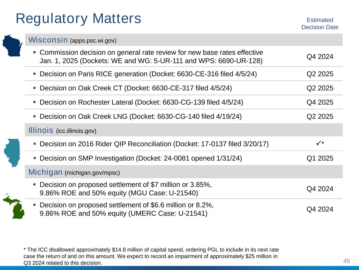 45 Estimated Decision Date Wisconsin (apps.psc.wi.gov) Commission decision on general rate review for new base rates effective Jan. 1, 2025 (Dockets: WE and WG: 5-UR-111 and WPS: 6690-UR-128) Q4 2024 Decision on Paris RICE generation (Docket: 6630-CE-316 filed 4/5/24) Q2 2025 Decision on Oak Creek CT (Docket: 6630-CE-317 filed 4/5/24) Q2 2025 Decision on Rochester Lateral (Docket: 6630-CG-139 filed 4/5/24) Q4 2025 Decision on Oak Creek LNG (Docket: 6630-CG-140 filed 4/19/24) Q2 2025 Illinois (icc.illinois.gov) Decision on 2016 Rider QIP Reconciliation (Docket: 17-0137 filed 3/20/17) * Decision on SMP Investigation (Docket: 24-0081 opened 1/31/24) Q1 2025 Michigan (michigan.gov/mpsc) Decision on proposed settlement of $7 million or 3.85%, 9.86% ROE and 50% equity (MGU Case: U-21540) Q4 2024 Decision on proposed settlement of $6.6 million or 8.2%, 9.86% ROE and 50% equity (UMERC Case: U-21541) Q4 2024 Regulatory Matters * The ICC disallowed approximately $14.8 million of capital spend, ordering PGL to include in its next rate case the return of and on this amount. We expect to record an impairment of approximately $25 million in Q3 2024 related to this decision.