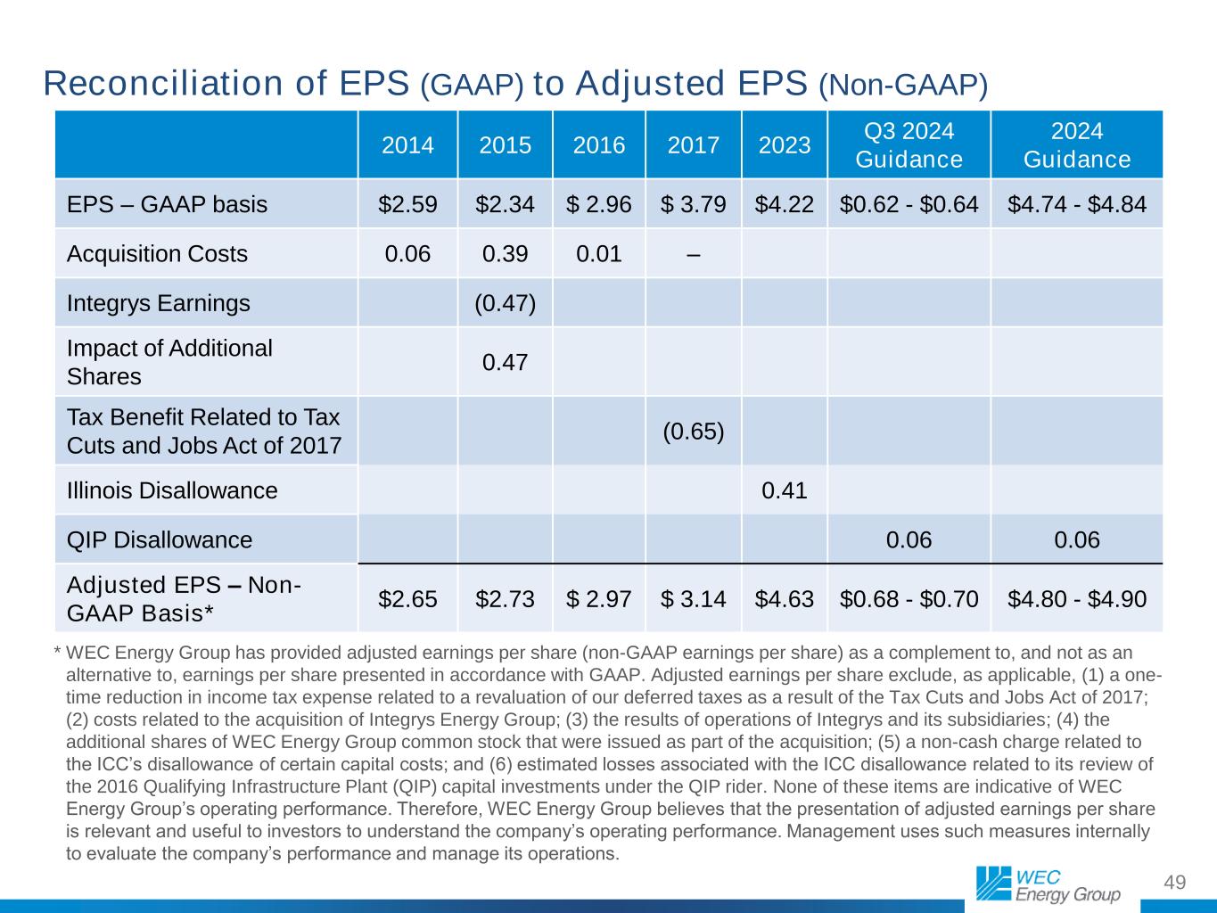49 Reconciliation of EPS (GAAP) to Adjusted EPS (Non-GAAP) 2014 2015 2016 2017 2023 Q3 2024 Guidance 2024 Guidance EPS – GAAP basis $2.59 $2.34 $ 2.96 $ 3.79 $4.22 $0.62 - $0.64 $4.74 - $4.84 Acquisition Costs 0.06 0.39 0.01 – Integrys Earnings (0.47) Impact of Additional Shares 0.47 Tax Benefit Related to Tax Cuts and Jobs Act of 2017 (0.65) Illinois Disallowance 0.41 QIP Disallowance 0.06 0.06 Adjusted EPS – Non- GAAP Basis* $2.65 $2.73 $ 2.97 $ 3.14 $4.63 $0.68 - $0.70 $4.80 - $4.90 * WEC Energy Group has provided adjusted earnings per share (non-GAAP earnings per share) as a complement to, and not as an alternative to, earnings per share presented in accordance with GAAP. Adjusted earnings per share exclude, as applicable, (1) a one- time reduction in income tax expense related to a revaluation of our deferred taxes as a result of the Tax Cuts and Jobs Act of 2017; (2) costs related to the acquisition of Integrys Energy Group; (3) the results of operations of Integrys and its subsidiaries; (4) the additional shares of WEC Energy Group common stock that were issued as part of the acquisition; (5) a non-cash charge related to the ICC’s disallowance of certain capital costs; and (6) estimated losses associated with the ICC disallowance related to its review of the 2016 Qualifying Infrastructure Plant (QIP) capital investments under the QIP rider. None of these items are indicative of WEC Energy Group’s operating performance. Therefore, WEC Energy Group believes that the presentation of adjusted earnings per share is relevant and useful to investors to understand the company’s operating performance. Management uses such measures internally to evaluate the company’s performance and manage its operations.