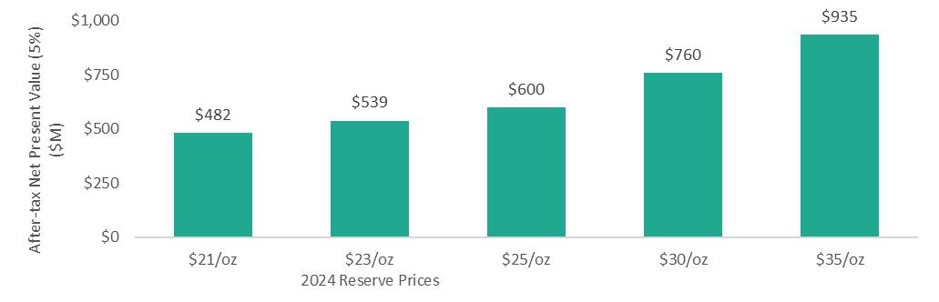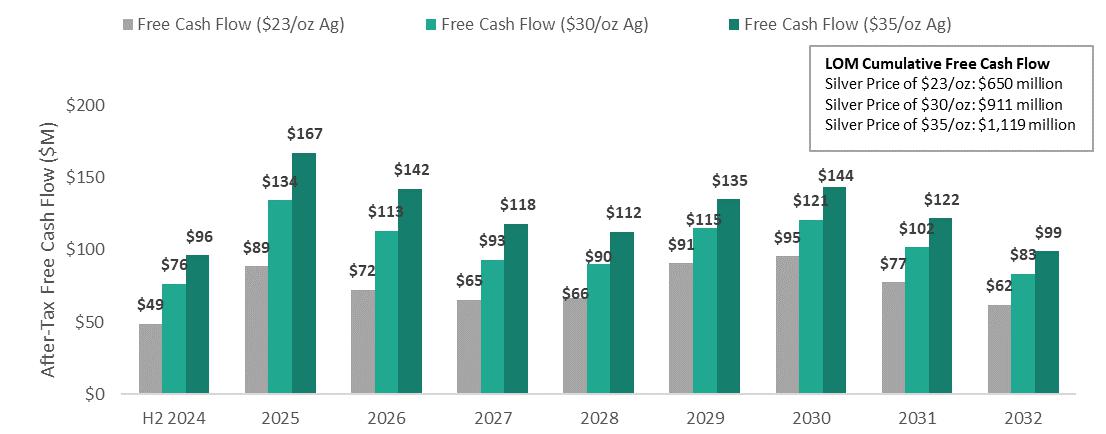 5 NPV and free cash flow sensitivities presented here consider $30/oz Ag and $35/oz Ag, with other prices reflecting the 2024 reserve price assumptions described above. NPV is as of July 1, 2024 using a 5% discount rate.