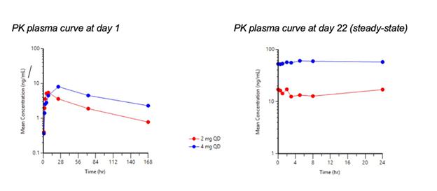 Pharmacokinetics (PK) data for cohort 1 (2mg) and cohort 2 (4mg) at day 1 and day 22 (steady state)