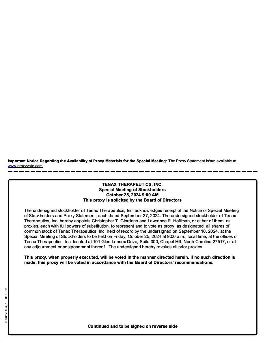 Notice is hereby given that Tenax Therapeutics, Inc. (the “Company”) will hold a special meeting of stockholders (the “Special Meeting”) on October 25, 2024, at 9:00 a.m., Eastern Time at 101 Glen Lennox Drive, Suite 300, Chapel Hill, North Carolina.