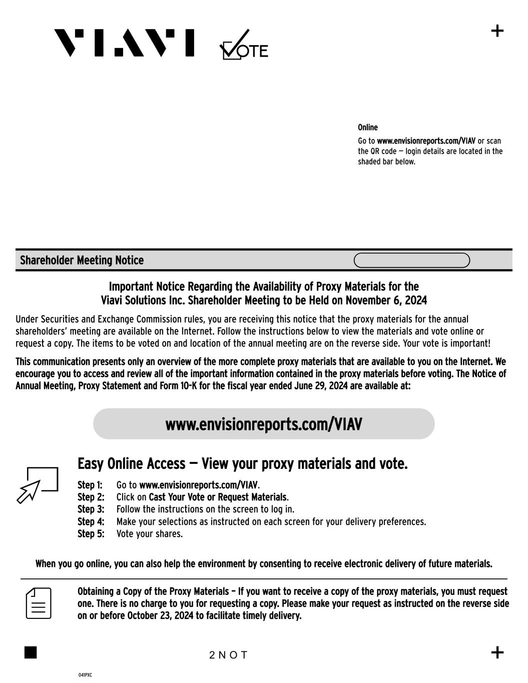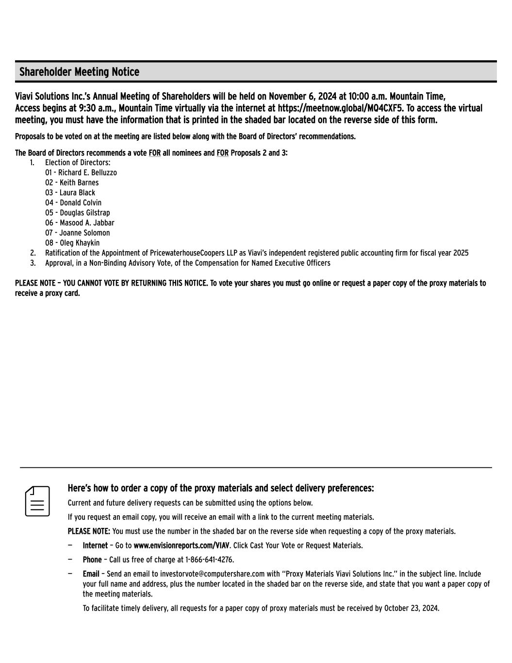 Here’s how to order a copy of the proxy materials and select delivery preferences: Current and future delivery requests can be submitted using the options below. If you request an email copy, you will receive an email with a link to the current meeting materials. PLEASE NOTE: You must use the number in the shaded bar on the reverse side when requesting a copy of the proxy materials. — Internet – Go to www.envisionreports.com/VIAV. Click Cast Your Vote or Request Materials. — Phone – Call us free of charge at 1-866-641-4276. — Email – Send an email to investorvote@computershare.com with “Proxy Materials Viavi Solutions Inc.” in the subject line. Include your full name and address, plus the number located in the shaded bar on the reverse side, and state that you want a paper copy of the meeting materials. To facilitate timely delivery, all requests for a paper copy of proxy materials must be received by October 23, 2024. Viavi Solutions Inc.’s Annual Meeting of Shareholders will be held on November 6, 2024 at 10:00 a.m. Mountain Time, Access begins at 9:30 a.m., Mountain Time virtually via the internet at https://meetnow.global/MQ4CXF5. To access the virtual meeting, you must have the information that is printed in the shaded bar located on the reverse side of this form. Proposals to be voted on at the meeting are listed below along with the Board of Directors’ recommendations. The Board of Directors recommends a vote FOR all nominees and FOR Proposals 2 and 3: 1. Election of Directors: 01 - Richard E. Belluzzo 02 - Keith Barnes 03 - Laura Black 04 - Donald Colvin 05 - Douglas Gilstrap 06 - Masood A. Jabbar 07 - Joanne Solomon 08 - Oleg Khaykin 2. Ratification of the Appointment of PricewaterhouseCoopers LLP as Viavi’s independent registered public accounting firm for fiscal year 2025 3. Approval, in a Non-Binding Advisory Vote, of the Compensation for Named Executive Officers PLEASE NOTE – YOU CANNOT VOTE BY RETURNING THIS NOTICE. To vote your shares you must go online or request a paper copy of the proxy materials to receive a proxy card. Shareholder Meeting Notice