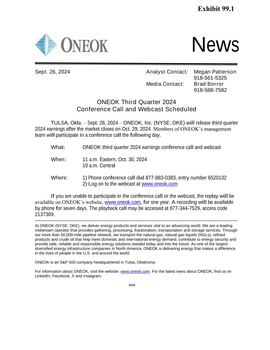 News ONEOK Third Quarter 2024 Conference Call and Webcast Scheduled TULSA, Okla. – Sept. 26, 2024 – ONEOK, Inc. (NYSE: OKE) will release third quarter 2024 earnings after the market closes on Oct. 29, 2024. Members of ONEOK’s management team will participate in a conference call the following day. What: ONEOK third quarter 2024 earnings conference call and webcast When: 11 a.m. Eastern, Oct. 30, 2024 10 a.m. Central Where: 1) Phone conference call dial 877-883-0383, entry number 6520132 2) Log on to the webcast at www.oneok.com If you are unable to participate in the conference call or the webcast, the replay will be available on ONEOK’s website, www.oneok.com, for one year. A recording will be available by phone for seven days. The playback call may be accessed at 877-344-7529, access code 2137369. ------------------------------------------------------------------------------------------------------------------- At ONEOK (NYSE: OKE), we deliver energy products and services vital to an advancing world. We are a leading midstream operator that provides gathering, processing, fractionation, transportation and storage services. Through our more than 50,000-mile pipeline network, we transport the natural gas, natural gas liquids (NGLs), refined products and crude oil that help meet domestic and international energy demand, contribute to energy security and provide safe, reliable and responsible energy solutions needed today and into the future. As one of the largest diversified energy infrastructure companies in North America, ONEOK is delivering energy that makes a difference in the lives of people in the U.S. and around the world. ONEOK is an S&P 500 company headquartered in Tulsa, Oklahoma. For information about ONEOK, visit the website: www.oneok.com. For the latest news about ONEOK, find us on LinkedIn, Facebook, X and Instagram. ### Sept. 26, 2024 Analyst Contact: Megan Patterson 918-561-5325 Media Contact: Brad Borror 918-588-7582 Exhibit 99.1