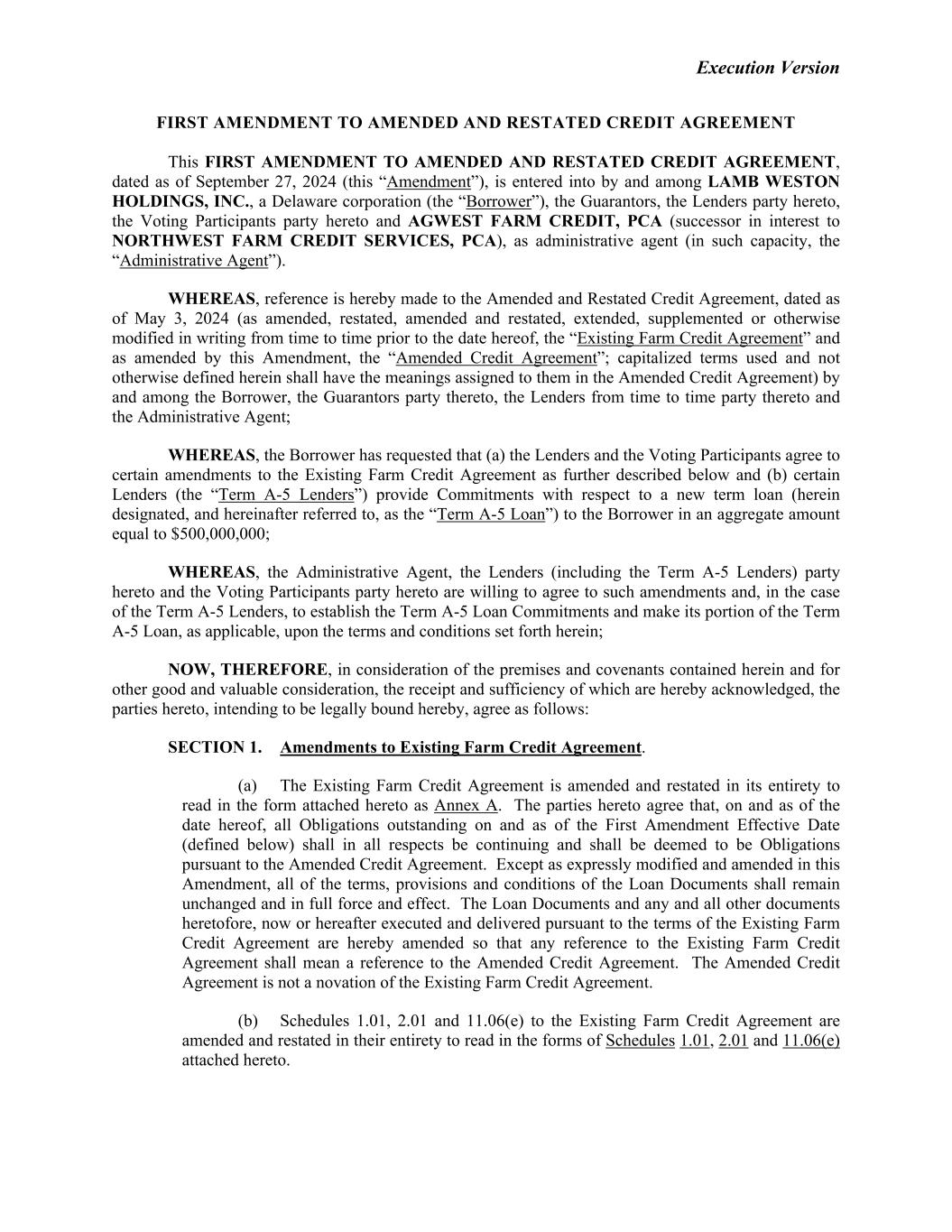 Execution Version FIRST AMENDMENT TO AMENDED AND RESTATED CREDIT AGREEMENT This FIRST AMENDMENT TO AMENDED AND RESTATED CREDIT AGREEMENT, dated as of September 27, 2024 (this “Amendment”), is entered into by and among LAMB WESTON HOLDINGS, INC., a Delaware corporation (the “Borrower”), the Guarantors, the Lenders party hereto, the Voting Participants party hereto and AGWEST FARM CREDIT, PCA (successor in interest to NORTHWEST FARM CREDIT SERVICES, PCA), as administrative agent (in such capacity, the “Administrative Agent”). WHEREAS, reference is hereby made to the Amended and Restated Credit Agreement, dated as of May 3, 2024 (as amended, restated, amended and restated, extended, supplemented or otherwise modified in writing from time to time prior to the date hereof, the “Existing Farm Credit Agreement” and as amended by this Amendment, the “Amended Credit Agreement”; capitalized terms used and not otherwise defined herein shall have the meanings assigned to them in the Amended Credit Agreement) by and among the Borrower, the Guarantors party thereto, the Lenders from time to time party thereto and the Administrative Agent; WHEREAS, the Borrower has requested that (a) the Lenders and the Voting Participants agree to certain amendments to the Existing Farm Credit Agreement as further described below and (b) certain Lenders (the “Term A-5 Lenders”) provide Commitments with respect to a new term loan (herein designated, and hereinafter referred to, as the “Term A-5 Loan”) to the Borrower in an aggregate amount equal to $500,000,000; WHEREAS, the Administrative Agent, the Lenders (including the Term A-5 Lenders) party hereto and the Voting Participants party hereto are willing to agree to such amendments and, in the case of the Term A-5 Lenders, to establish the Term A-5 Loan Commitments and make its portion of the Term A-5 Loan, as applicable, upon the terms and conditions set forth herein; NOW, THEREFORE, in consideration of the premises and covenants contained herein and for other good and valuable consideration, the receipt and sufficiency of which are hereby acknowledged, the parties hereto, intending to be legally bound hereby, agree as follows: SECTION 1. Amendments to Existing Farm Credit Agreement. (a) The Existing Farm Credit Agreement is amended and restated in its entirety to read in the form attached hereto as Annex A. The parties hereto agree that, on and as of the date hereof, all Obligations outstanding on and as of the First Amendment Effective Date (defined below) shall in all respects be continuing and shall be deemed to be Obligations pursuant to the Amended Credit Agreement. Except as expressly modified and amended in this Amendment, all of the terms, provisions and conditions of the Loan Documents shall remain unchanged and in full force and effect. The Loan Documents and any and all other documents heretofore, now or hereafter executed and delivered pursuant to the terms of the Existing Farm Credit Agreement are hereby amended so that any reference to the Existing Farm Credit Agreement shall mean a reference to the Amended Credit Agreement. The Amended Credit Agreement is not a novation of the Existing Farm Credit Agreement. (b) Schedules 1.01, 2.01 and 11.06(e) to the Existing Farm Credit Agreement are amended and restated in their entirety to read in the forms of Schedules 1.01, 2.01 and 11.06(e) attached hereto.