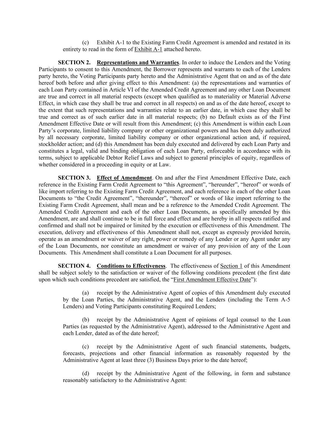 (c) Exhibit A-1 to the Existing Farm Credit Agreement is amended and restated in its entirety to read in the form of Exhibit A-1 attached hereto. SECTION 2. Representations and Warranties. In order to induce the Lenders and the Voting Participants to consent to this Amendment, the Borrower represents and warrants to each of the Lenders party hereto, the Voting Participants party hereto and the Administrative Agent that on and as of the date hereof both before and after giving effect to this Amendment: (a) the representations and warranties of each Loan Party contained in Article VI of the Amended Credit Agreement and any other Loan Document are true and correct in all material respects (except when qualified as to materiality or Material Adverse Effect, in which case they shall be true and correct in all respects) on and as of the date hereof, except to the extent that such representations and warranties relate to an earlier date, in which case they shall be true and correct as of such earlier date in all material respects; (b) no Default exists as of the First Amendment Effective Date or will result from this Amendment; (c) this Amendment is within each Loan Party’s corporate, limited liability company or other organizational powers and has been duly authorized by all necessary corporate, limited liability company or other organizational action and, if required, stockholder action; and (d) this Amendment has been duly executed and delivered by each Loan Party and constitutes a legal, valid and binding obligation of each Loan Party, enforceable in accordance with its terms, subject to applicable Debtor Relief Laws and subject to general principles of equity, regardless of whether considered in a proceeding in equity or at Law. SECTION 3. Effect of Amendment. On and after the First Amendment Effective Date, each reference in the Existing Farm Credit Agreement to “this Agreement”, “hereunder”, “hereof” or words of like import referring to the Existing Farm Credit Agreement, and each reference in each of the other Loan Documents to “the Credit Agreement”, “thereunder”, “thereof” or words of like import referring to the Existing Farm Credit Agreement, shall mean and be a reference to the Amended Credit Agreement. The Amended Credit Agreement and each of the other Loan Documents, as specifically amended by this Amendment, are and shall continue to be in full force and effect and are hereby in all respects ratified and confirmed and shall not be impaired or limited by the execution or effectiveness of this Amendment. The execution, delivery and effectiveness of this Amendment shall not, except as expressly provided herein, operate as an amendment or waiver of any right, power or remedy of any Lender or any Agent under any of the Loan Documents, nor constitute an amendment or waiver of any provision of any of the Loan Documents. This Amendment shall constitute a Loan Document for all purposes. SECTION 4. Conditions to Effectiveness. The effectiveness of Section 1 of this Amendment shall be subject solely to the satisfaction or waiver of the following conditions precedent (the first date upon which such conditions precedent are satisfied, the “First Amendment Effective Date”): (a) receipt by the Administrative Agent of copies of this Amendment duly executed by the Loan Parties, the Administrative Agent, and the Lenders (including the Term A-5 Lenders) and Voting Participants constituting Required Lenders; (b) receipt by the Administrative Agent of opinions of legal counsel to the Loan Parties (as requested by the Administrative Agent), addressed to the Administrative Agent and each Lender, dated as of the date hereof; (c) receipt by the Administrative Agent of such financial statements, budgets, forecasts, projections and other financial information as reasonably requested by the Administrative Agent at least three (3) Business Days prior to the date hereof; (d) receipt by the Administrative Agent of the following, in form and substance reasonably satisfactory to the Administrative Agent: