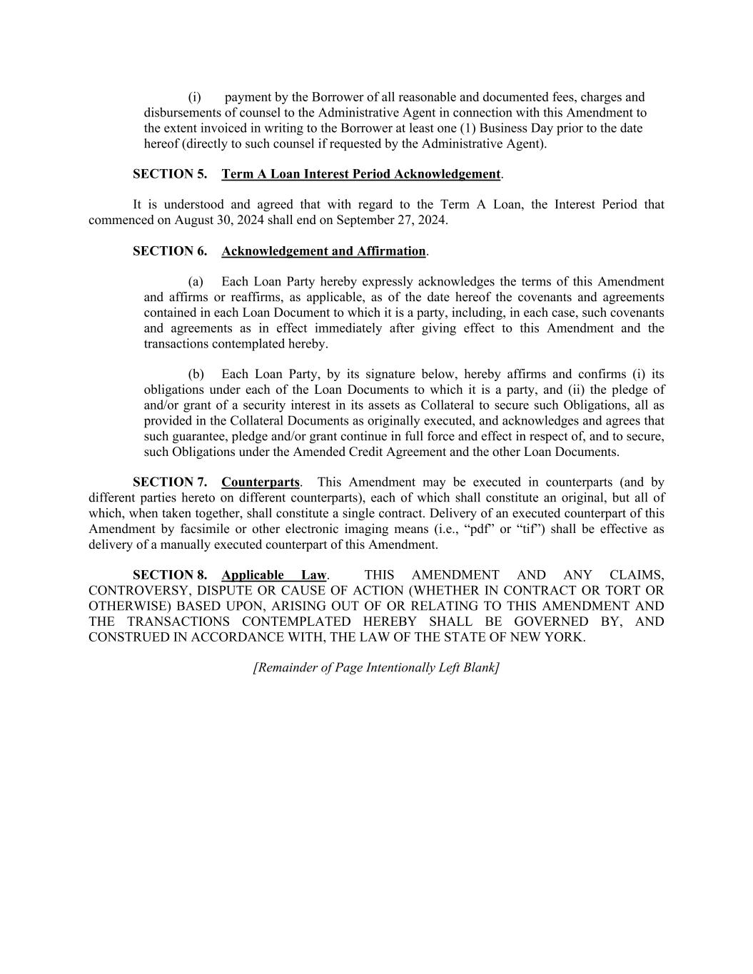 (i) payment by the Borrower of all reasonable and documented fees, charges and disbursements of counsel to the Administrative Agent in connection with this Amendment to the extent invoiced in writing to the Borrower at least one (1) Business Day prior to the date hereof (directly to such counsel if requested by the Administrative Agent). SECTION 5. Term A Loan Interest Period Acknowledgement. It is understood and agreed that with regard to the Term A Loan, the Interest Period that commenced on August 30, 2024 shall end on September 27, 2024. SECTION 6. Acknowledgement and Affirmation. (a) Each Loan Party hereby expressly acknowledges the terms of this Amendment and affirms or reaffirms, as applicable, as of the date hereof the covenants and agreements contained in each Loan Document to which it is a party, including, in each case, such covenants and agreements as in effect immediately after giving effect to this Amendment and the transactions contemplated hereby. (b) Each Loan Party, by its signature below, hereby affirms and confirms (i) its obligations under each of the Loan Documents to which it is a party, and (ii) the pledge of and/or grant of a security interest in its assets as Collateral to secure such Obligations, all as provided in the Collateral Documents as originally executed, and acknowledges and agrees that such guarantee, pledge and/or grant continue in full force and effect in respect of, and to secure, such Obligations under the Amended Credit Agreement and the other Loan Documents. SECTION 7. Counterparts. This Amendment may be executed in counterparts (and by different parties hereto on different counterparts), each of which shall constitute an original, but all of which, when taken together, shall constitute a single contract. Delivery of an executed counterpart of this Amendment by facsimile or other electronic imaging means (i.e., “pdf” or “tif”) shall be effective as delivery of a manually executed counterpart of this Amendment. SECTION 8. Applicable Law. THIS AMENDMENT AND ANY CLAIMS, CONTROVERSY, DISPUTE OR CAUSE OF ACTION (WHETHER IN CONTRACT OR TORT OR OTHERWISE) BASED UPON, ARISING OUT OF OR RELATING TO THIS AMENDMENT AND THE TRANSACTIONS CONTEMPLATED HEREBY SHALL BE GOVERNED BY, AND CONSTRUED IN ACCORDANCE WITH, THE LAW OF THE STATE OF NEW YORK. [Remainder of Page Intentionally Left Blank]