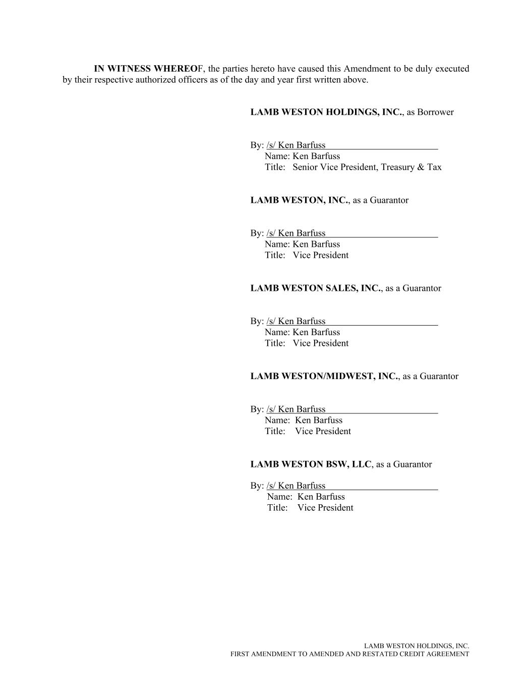 LAMB WESTON HOLDINGS, INC. FIRST AMENDMENT TO AMENDED AND RESTATED CREDIT AGREEMENT IN WITNESS WHEREOF, the parties hereto have caused this Amendment to be duly executed by their respective authorized officers as of the day and year first written above. LAMB WESTON HOLDINGS, INC., as Borrower By: /s/ Ken Barfuss Name: Ken Barfuss Title: Senior Vice President, Treasury & Tax LAMB WESTON, INC., as a Guarantor By: /s/ Ken Barfuss Name: Ken Barfuss Title: Vice President LAMB WESTON SALES, INC., as a Guarantor By: /s/ Ken Barfuss Name: Ken Barfuss Title: Vice President LAMB WESTON/MIDWEST, INC., as a Guarantor By: /s/ Ken Barfuss Name: Ken Barfuss Title: Vice President LAMB WESTON BSW, LLC, as a Guarantor By: /s/ Ken Barfuss Name: Ken Barfuss Title: Vice President