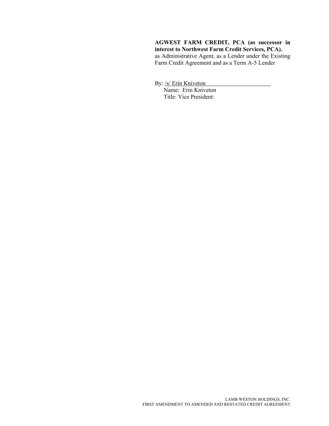 LAMB WESTON HOLDINGS, INC. FIRST AMENDMENT TO AMENDED AND RESTATED CREDIT AGREEMENT AGWEST FARM CREDIT, PCA (as successor in interest to Northwest Farm Credit Services, PCA), as Administrative Agent, as a Lender under the Existing Farm Credit Agreement and as a Term A-5 Lender By: /s/ Erin Kniveton Name: Erin Kniveton Title: Vice President: