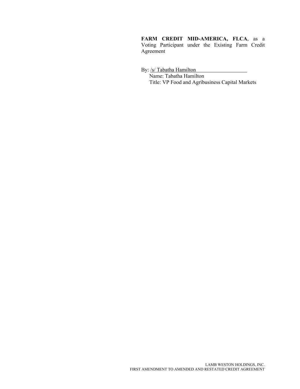 LAMB WESTON HOLDINGS, INC. FIRST AMENDMENT TO AMENDED AND RESTATED CREDIT AGREEMENT FARM CREDIT MID-AMERICA, FLCA, as a Voting Participant under the Existing Farm Credit Agreement By: /s/ Tabatha Hamilton Name: Tabatha Hamilton Title: VP Food and Agribusiness Capital Markets