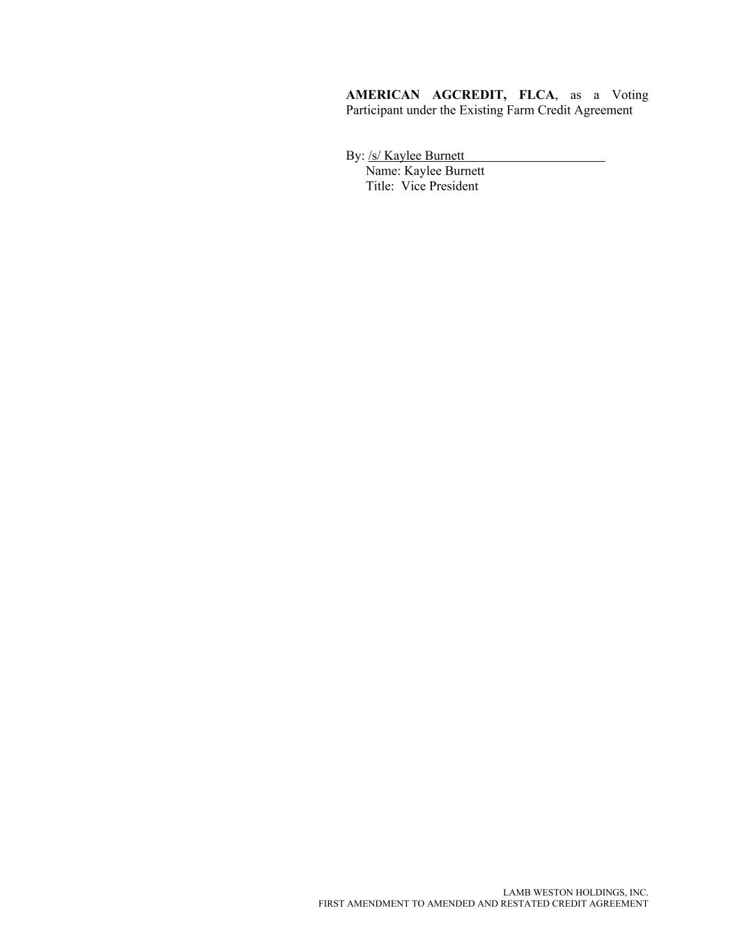LAMB WESTON HOLDINGS, INC. FIRST AMENDMENT TO AMENDED AND RESTATED CREDIT AGREEMENT AMERICAN AGCREDIT, FLCA, as a Voting Participant under the Existing Farm Credit Agreement By: /s/ Kaylee Burnett Name: Kaylee Burnett Title: Vice President