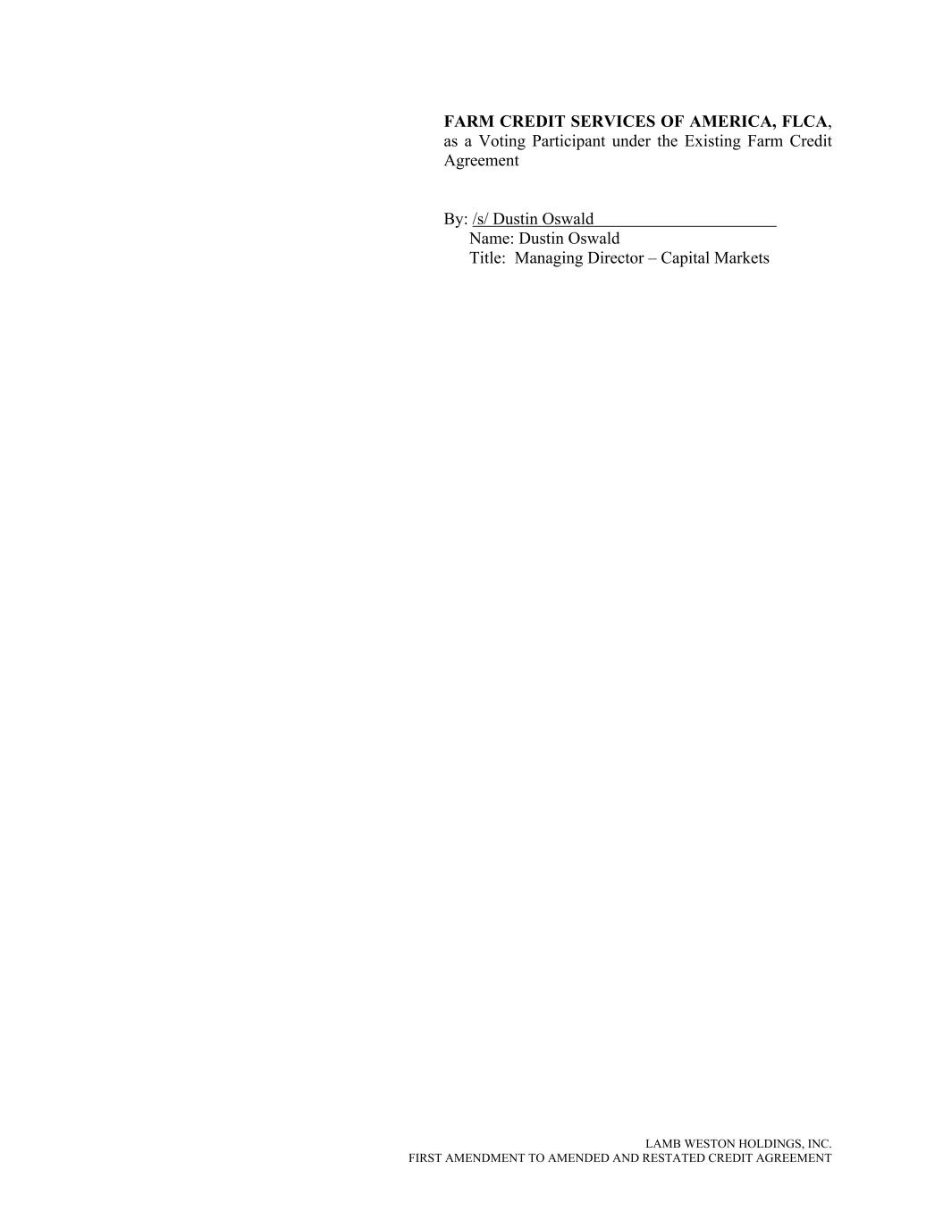 LAMB WESTON HOLDINGS, INC. FIRST AMENDMENT TO AMENDED AND RESTATED CREDIT AGREEMENT FARM CREDIT SERVICES OF AMERICA, FLCA, as a Voting Participant under the Existing Farm Credit Agreement By: /s/ Dustin Oswald Name: Dustin Oswald Title: Managing Director – Capital Markets