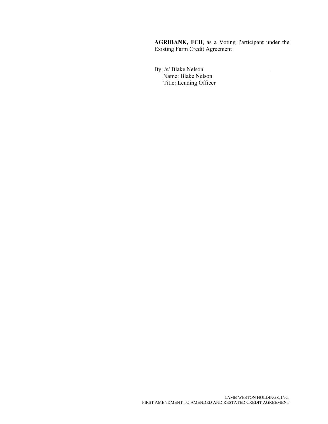 LAMB WESTON HOLDINGS, INC. FIRST AMENDMENT TO AMENDED AND RESTATED CREDIT AGREEMENT AGRIBANK, FCB, as a Voting Participant under the Existing Farm Credit Agreement By: /s/ Blake Nelson Name: Blake Nelson Title: Lending Officer
