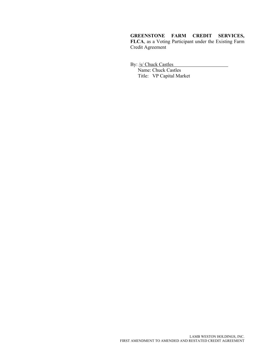 LAMB WESTON HOLDINGS, INC. FIRST AMENDMENT TO AMENDED AND RESTATED CREDIT AGREEMENT GREENSTONE FARM CREDIT SERVICES, FLCA, as a Voting Participant under the Existing Farm Credit Agreement By: /s/ Chuck Castles Name: Chuck Castles Title: VP Capital Market