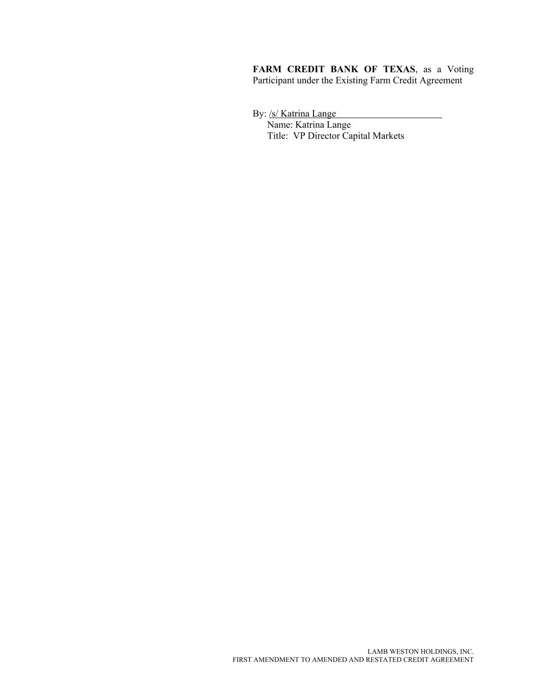 LAMB WESTON HOLDINGS, INC. FIRST AMENDMENT TO AMENDED AND RESTATED CREDIT AGREEMENT FARM CREDIT BANK OF TEXAS, as a Voting Participant under the Existing Farm Credit Agreement By: /s/ Katrina Lange Name: Katrina Lange Title: VP Director Capital Markets