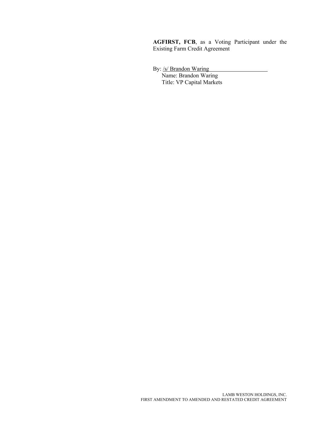 LAMB WESTON HOLDINGS, INC. FIRST AMENDMENT TO AMENDED AND RESTATED CREDIT AGREEMENT AGFIRST, FCB, as a Voting Participant under the Existing Farm Credit Agreement By: /s/ Brandon Waring Name: Brandon Waring Title: VP Capital Markets