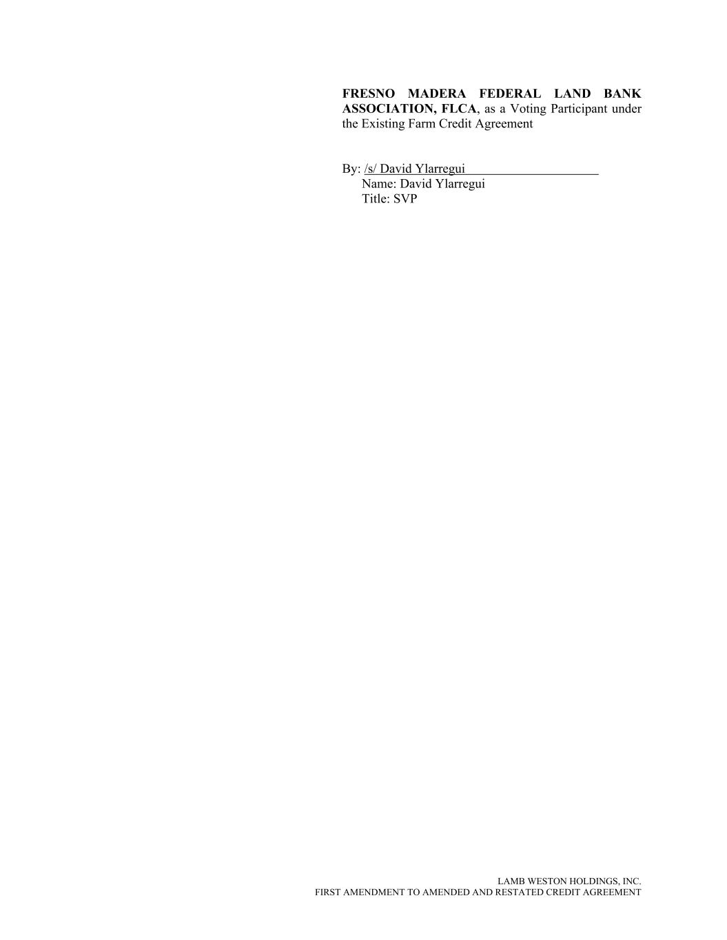 LAMB WESTON HOLDINGS, INC. FIRST AMENDMENT TO AMENDED AND RESTATED CREDIT AGREEMENT FRESNO MADERA FEDERAL LAND BANK ASSOCIATION, FLCA, as a Voting Participant under the Existing Farm Credit Agreement By: /s/ David Ylarregui Name: David Ylarregui Title: SVP