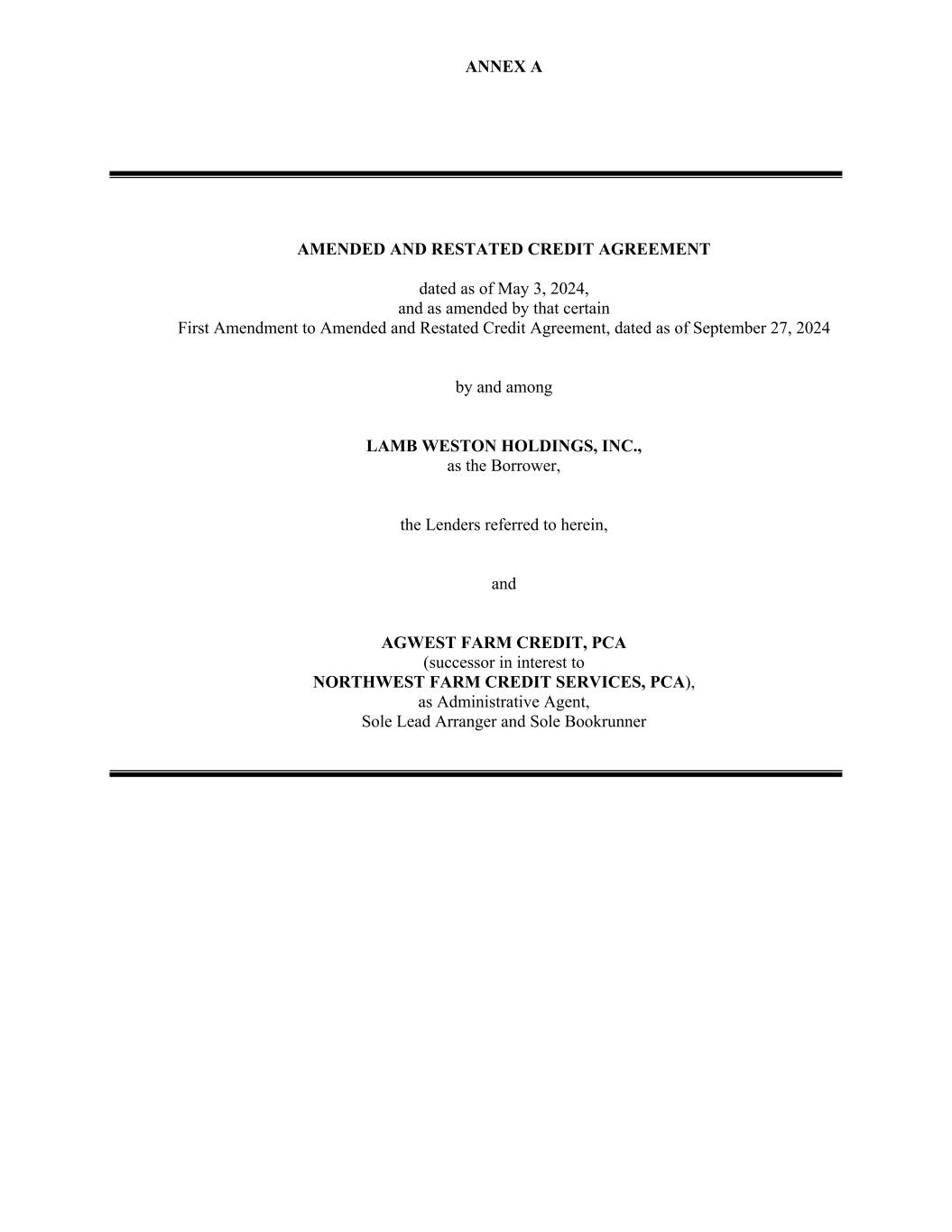 ANNEX A AMENDED AND RESTATED CREDIT AGREEMENT dated as of May 3, 2024, and as amended by that certain First Amendment to Amended and Restated Credit Agreement, dated as of September 27, 2024 by and among LAMB WESTON HOLDINGS, INC., as the Borrower, the Lenders referred to herein, and AGWEST FARM CREDIT, PCA (successor in interest to NORTHWEST FARM CREDIT SERVICES, PCA), as Administrative Agent, Sole Lead Arranger and Sole Bookrunner